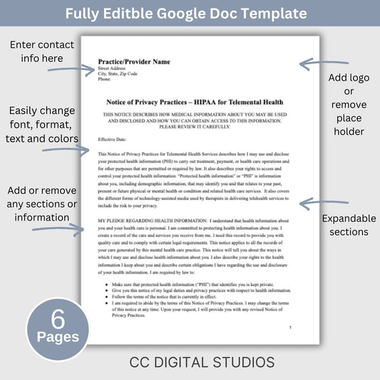 Notice of Privacy Practices HIPAA Template for Telemental Health