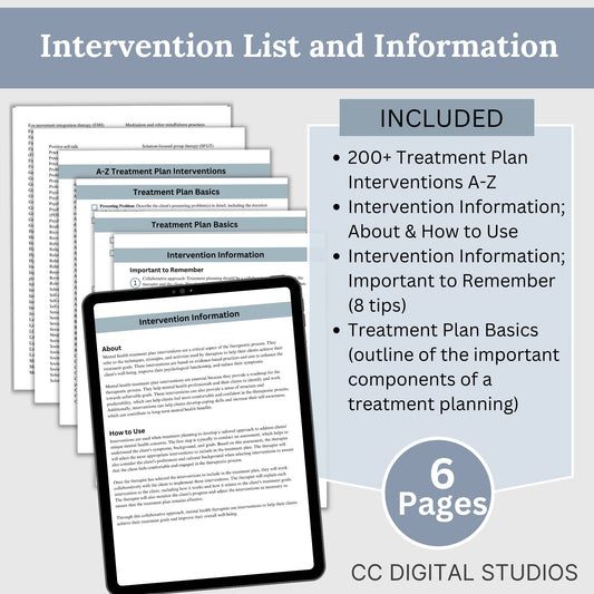 Therapy Interventions List & Treatment Planning Educational Material, Documentation Terms Reference