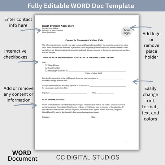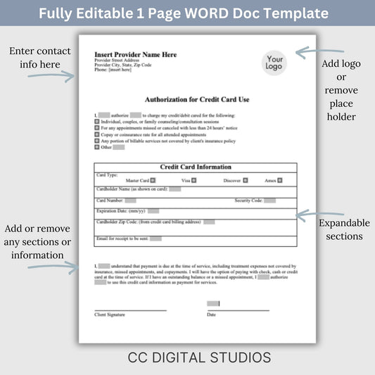 Credit Card Authorization Template: Editable WORD Doc for Therapist Offices
