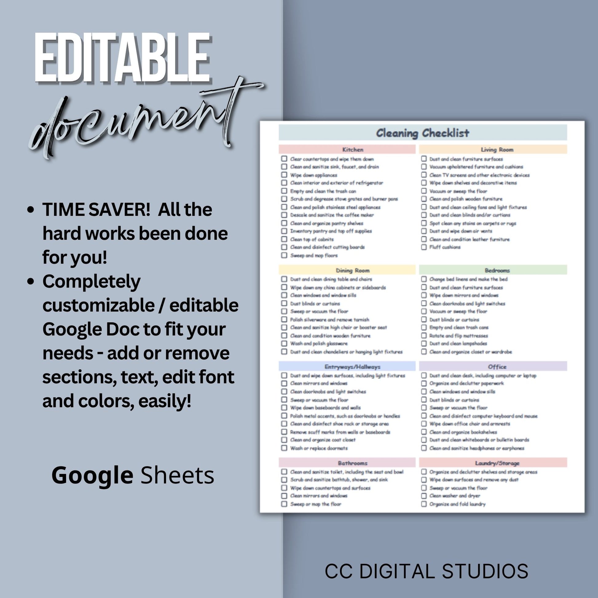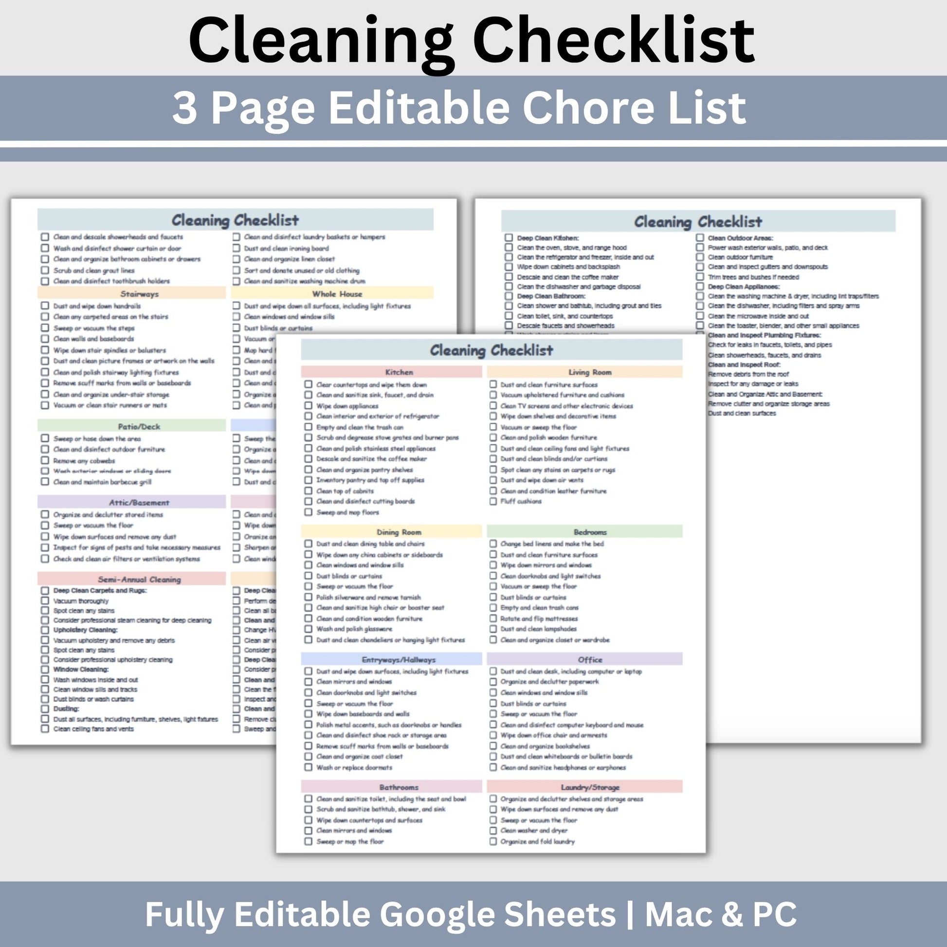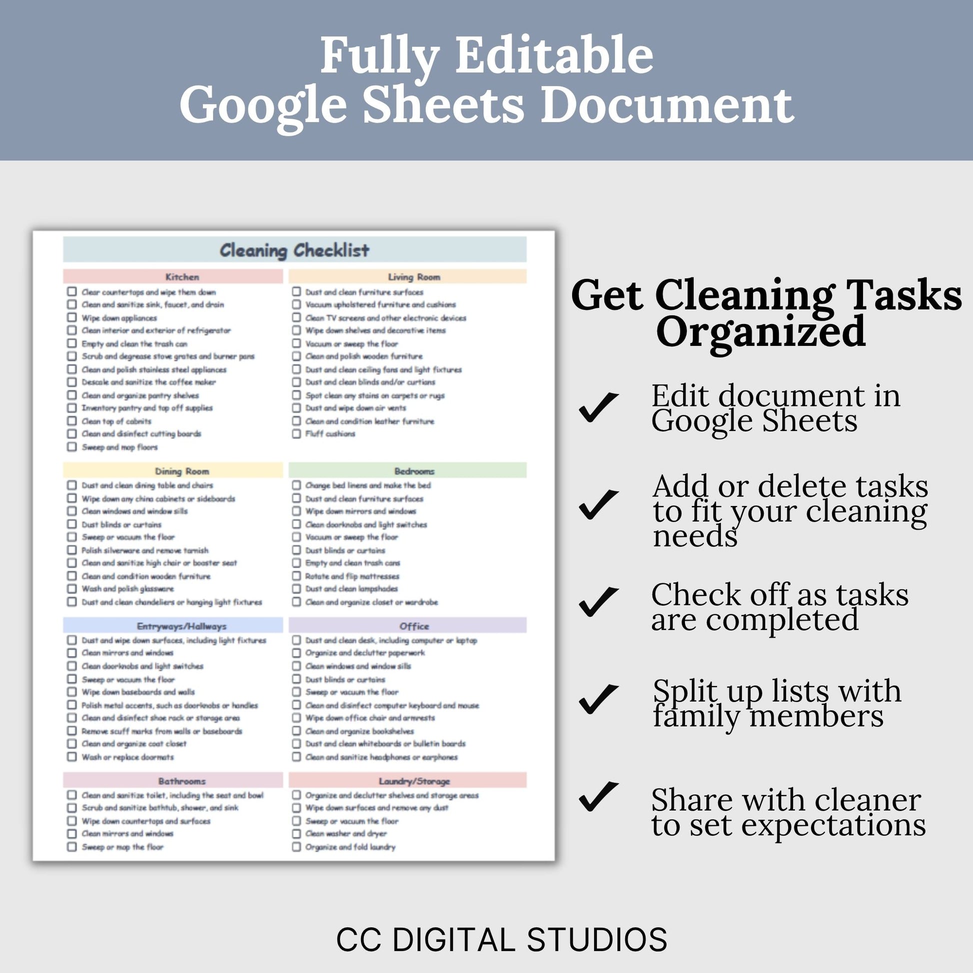 Are you tired of feeling overwhelmed by household cleaning tasks? Do you want a comprehensive and organized solution to keep your home in tip-top shape? Look no further! Our editable Google Sheets Cleaning Checklist is here to simplify your cleaning routine and ensure your living space stays sparkling clean throughout the year.