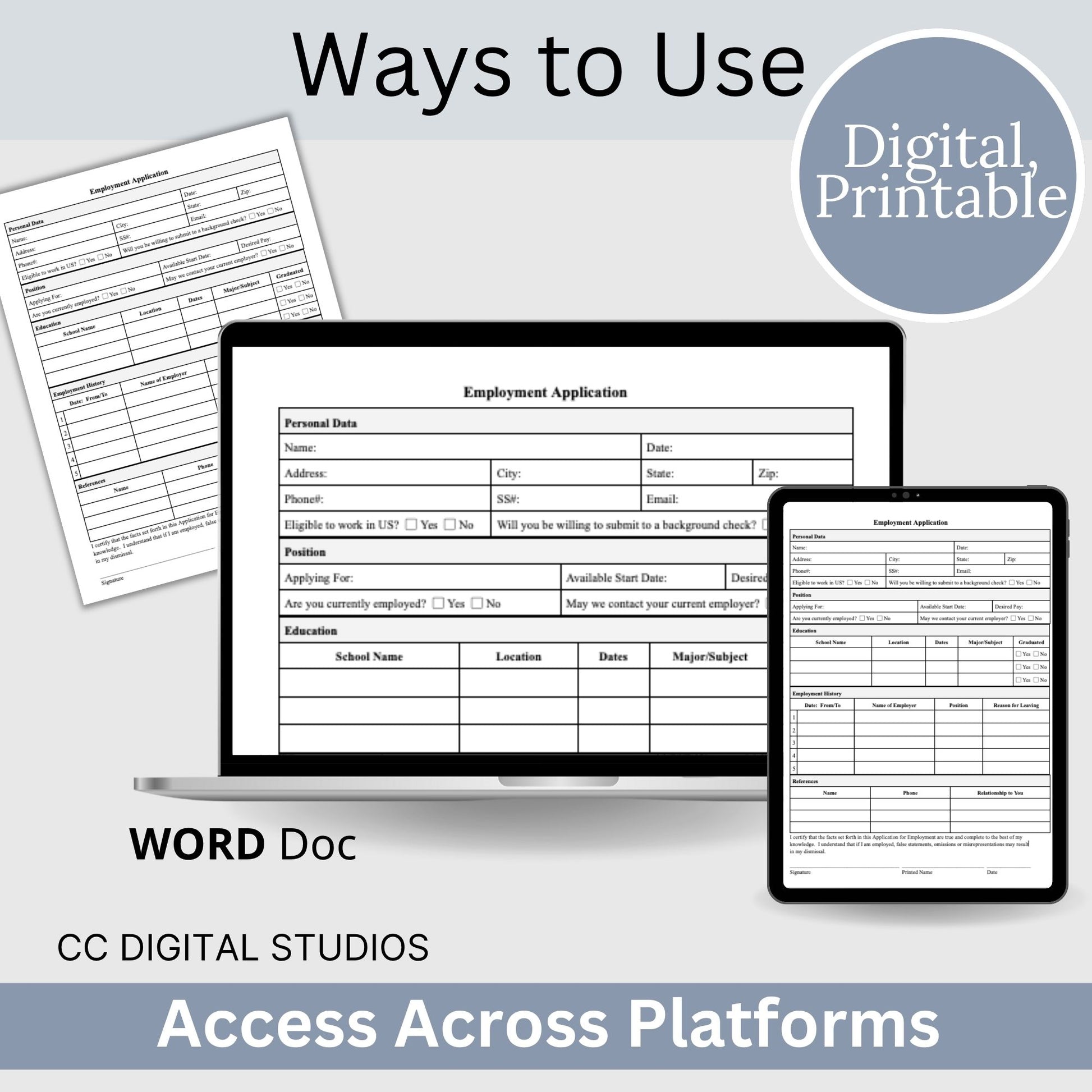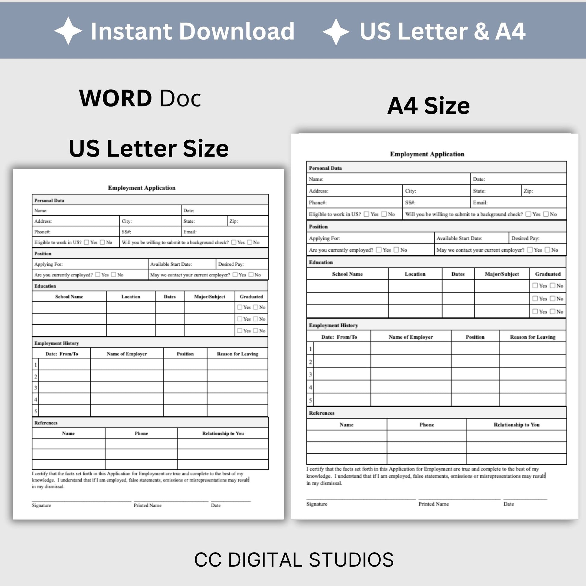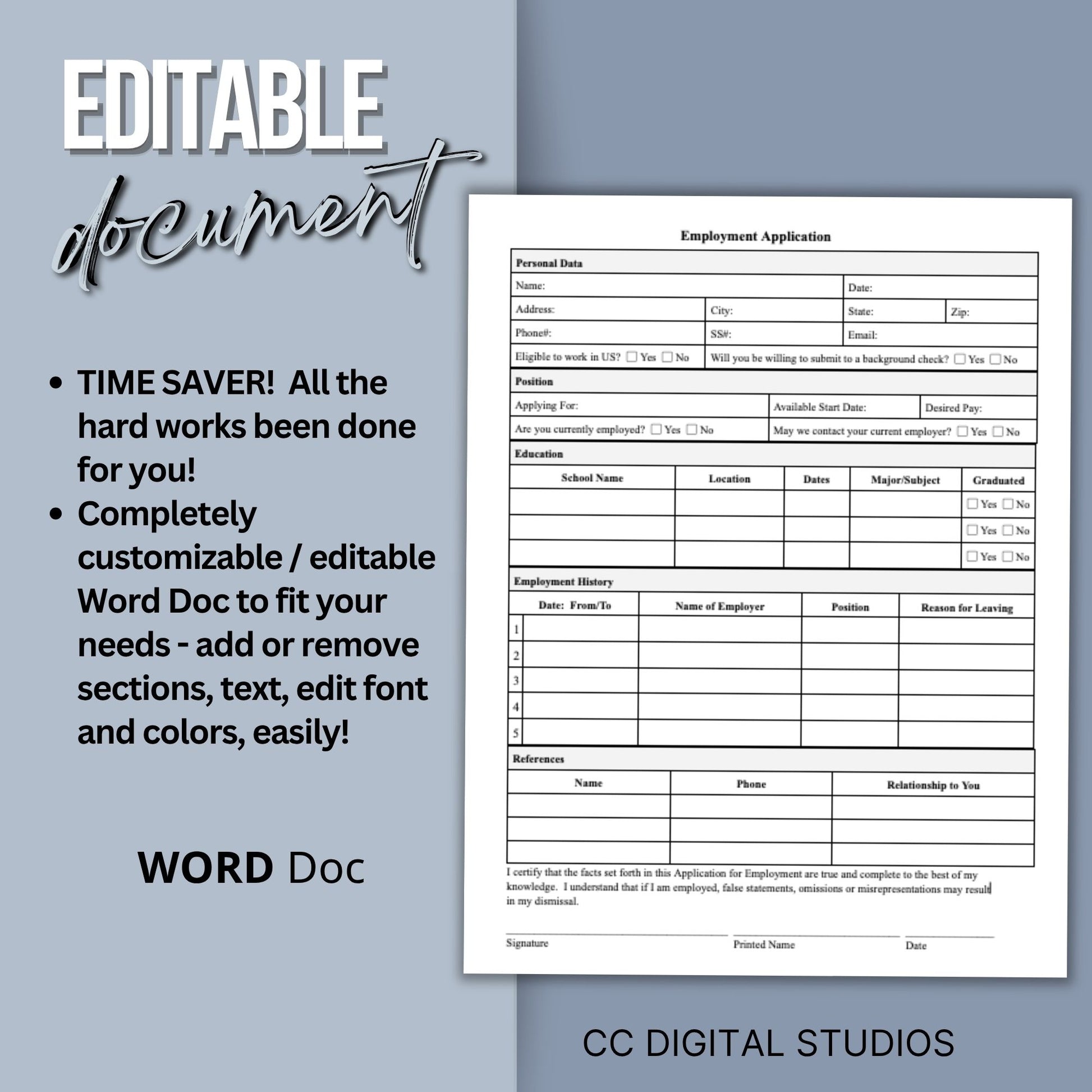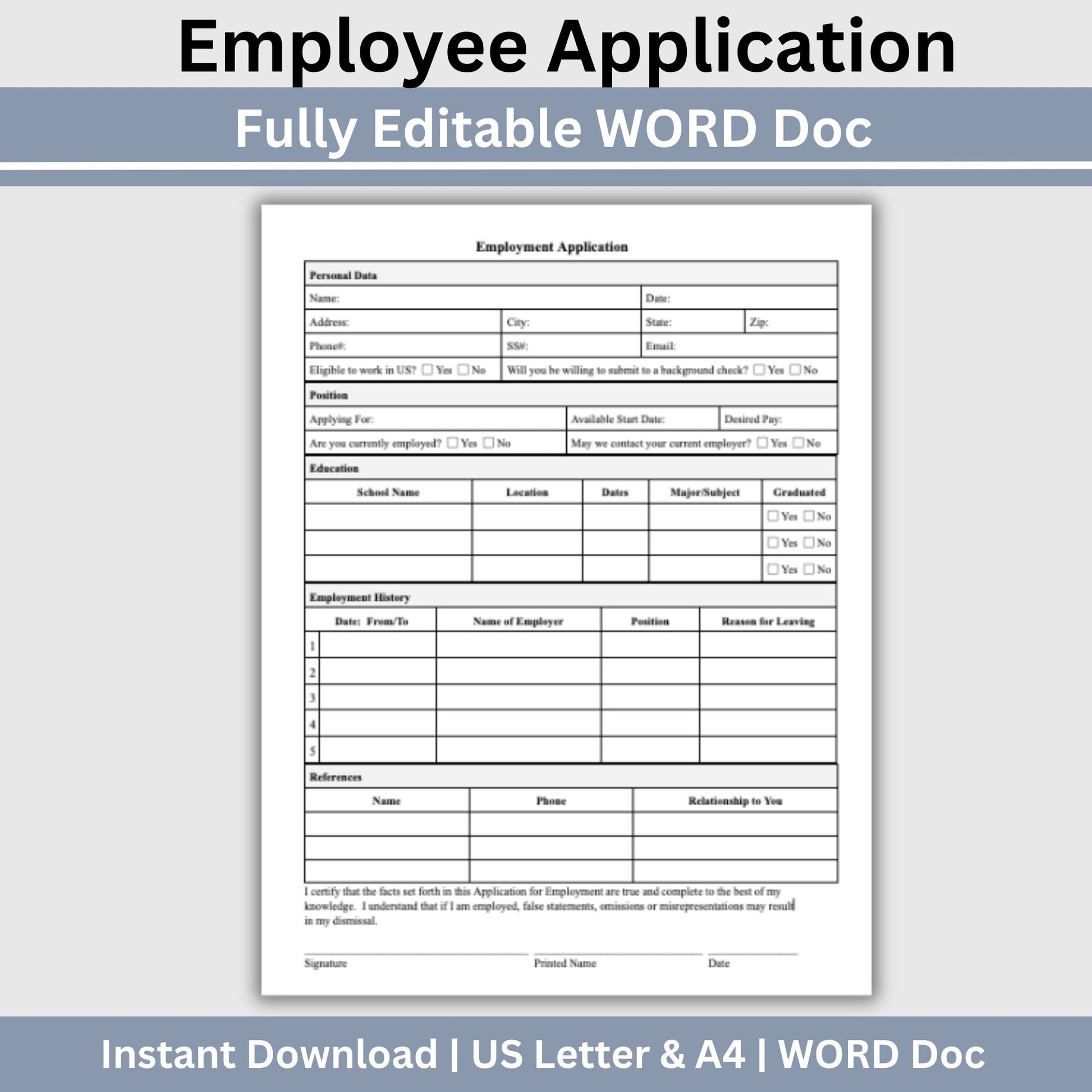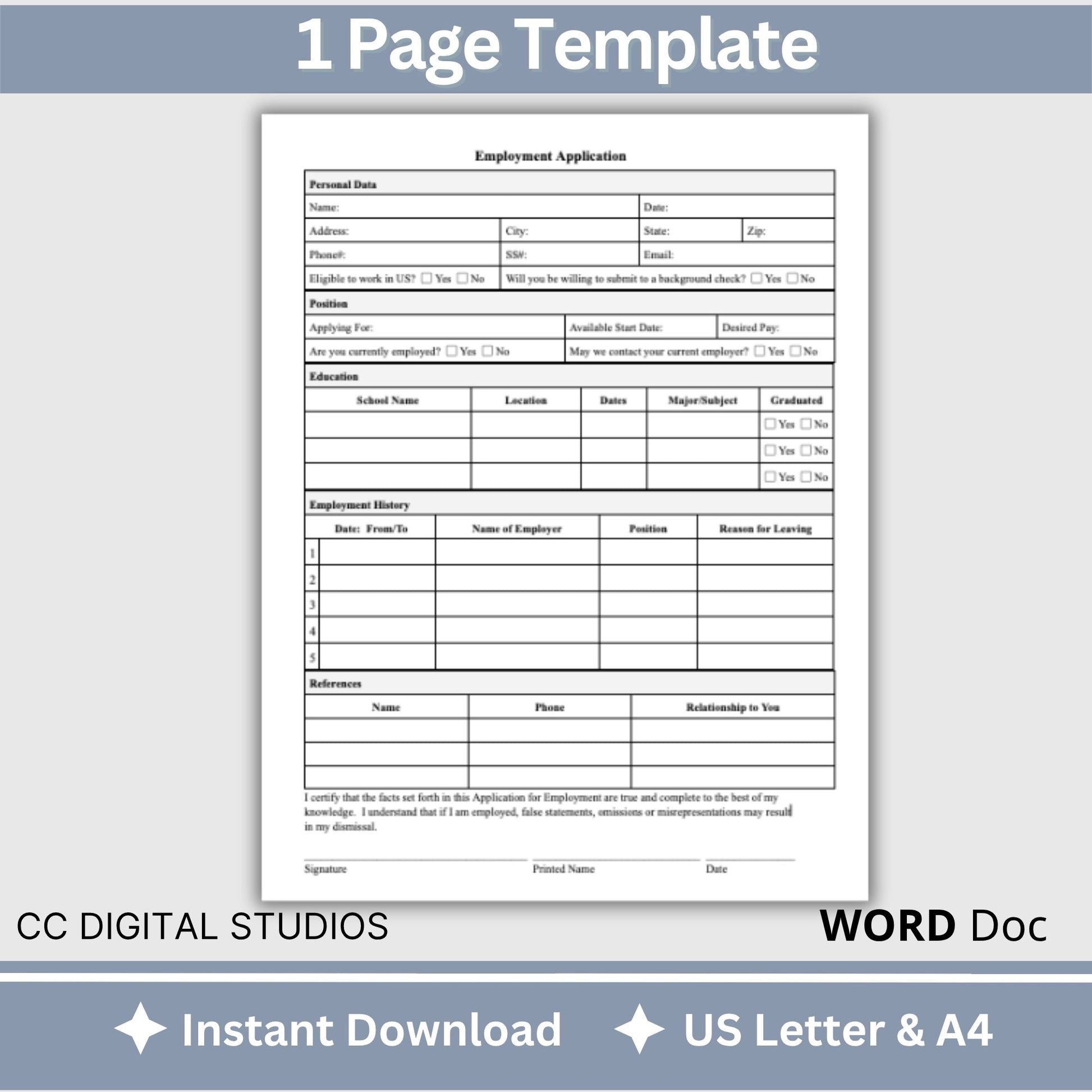 Are you in search of an efficient tool to simplify your hiring process? Look no further! Our 1 page editable WORD employment application template is here to streamline your recruitment efforts and help you find the ideal candidate with ease.
