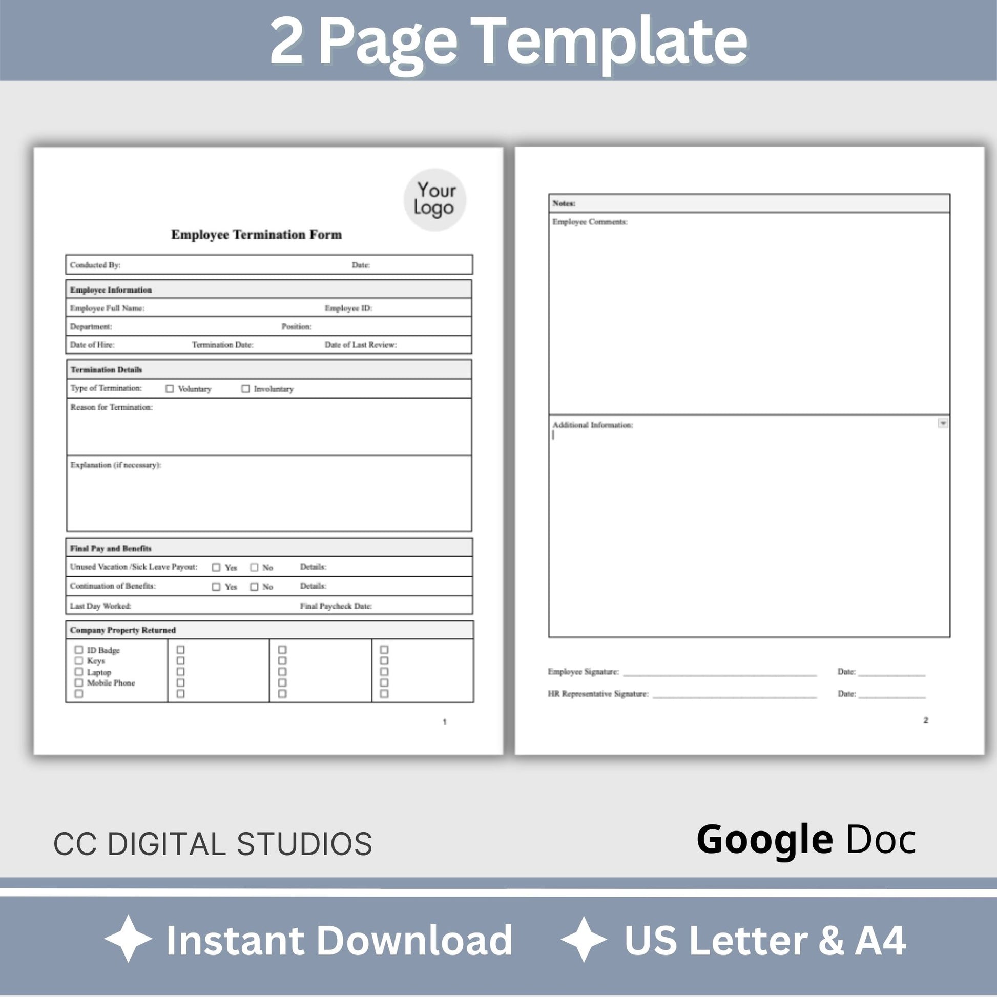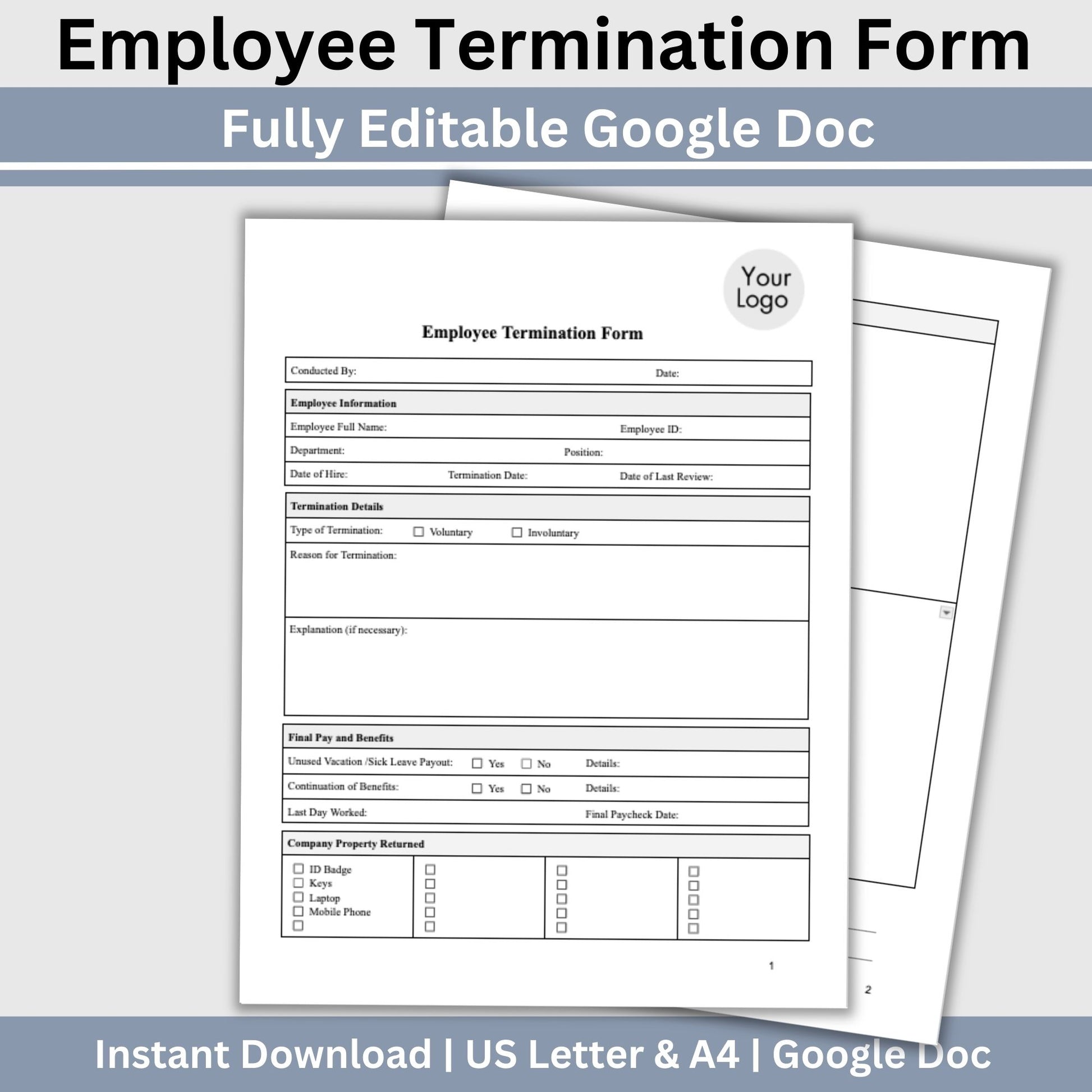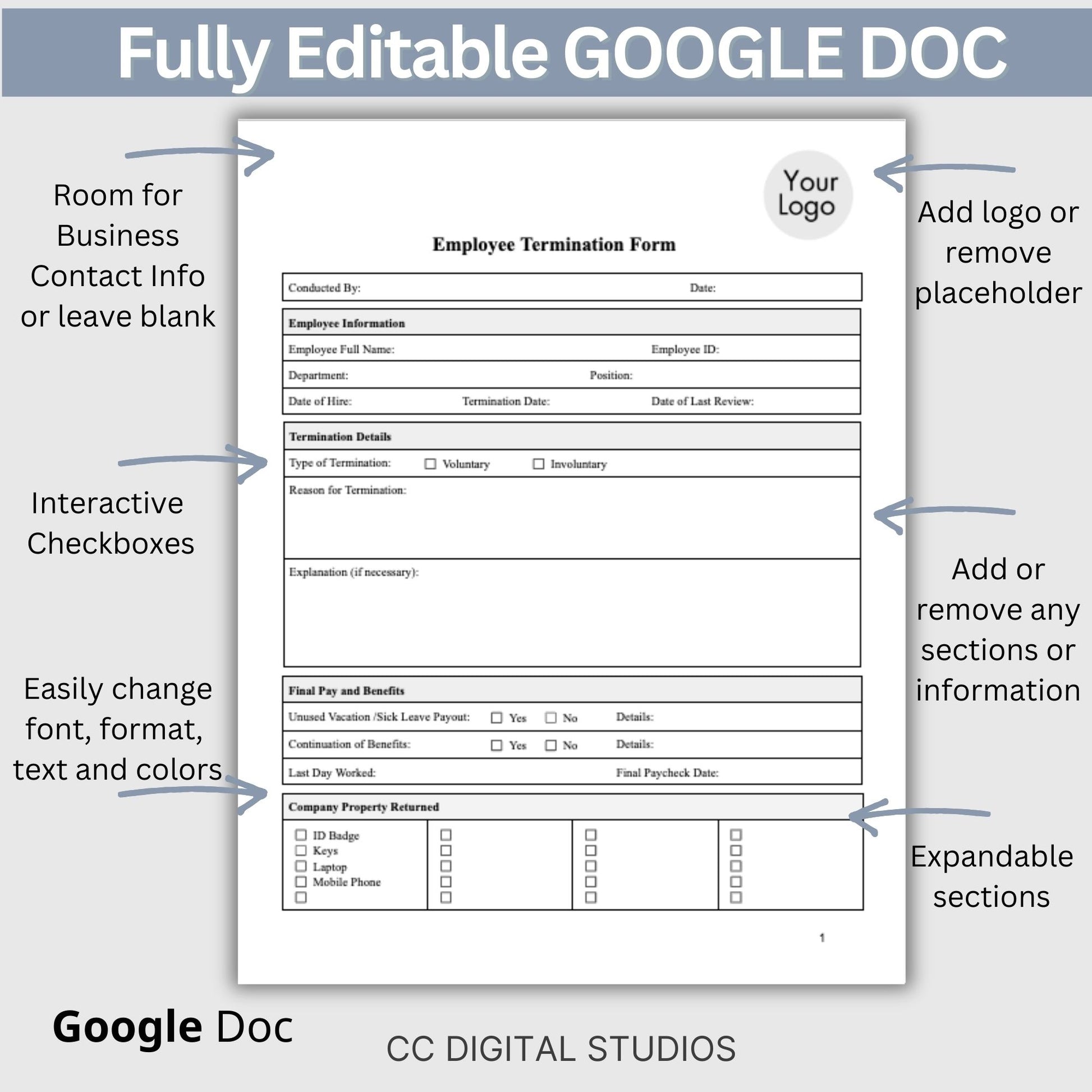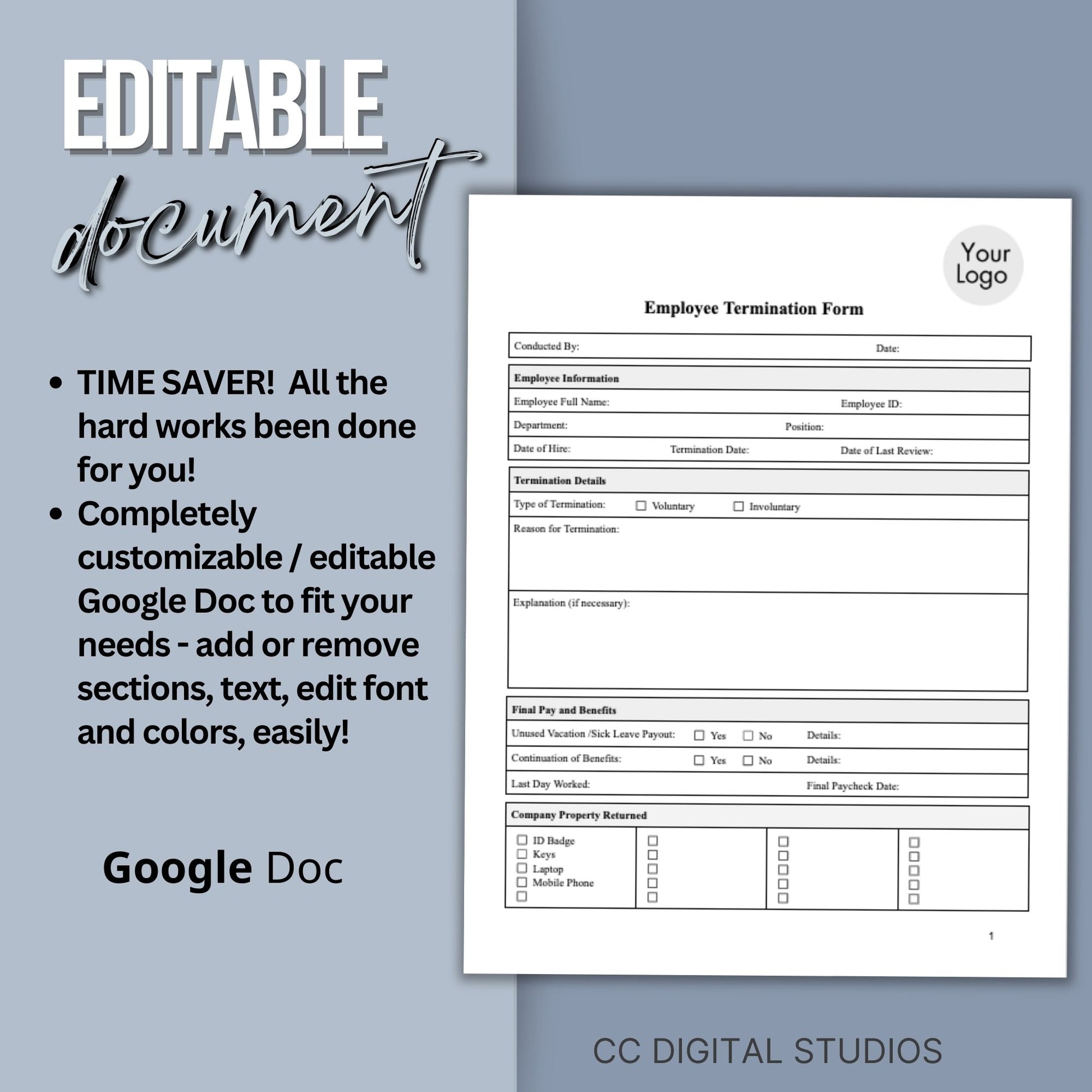 Employee termination form for HR professionals and small business. Editable google doc form. Customize to fit your business needs including adding company logo and information. This form allows for documenting employee termination information. Includes area to capture employee signature.