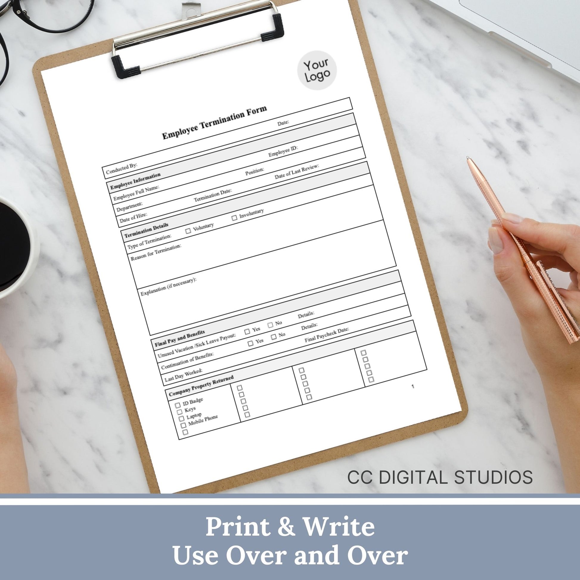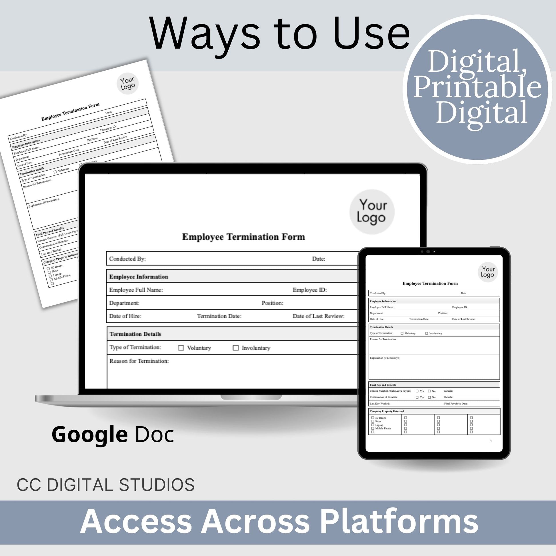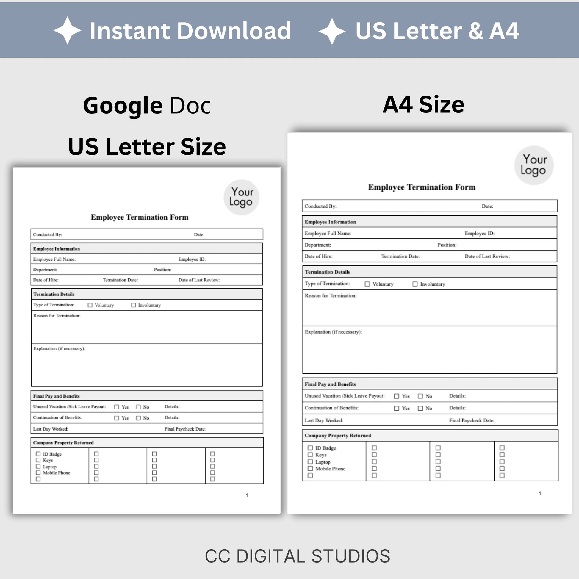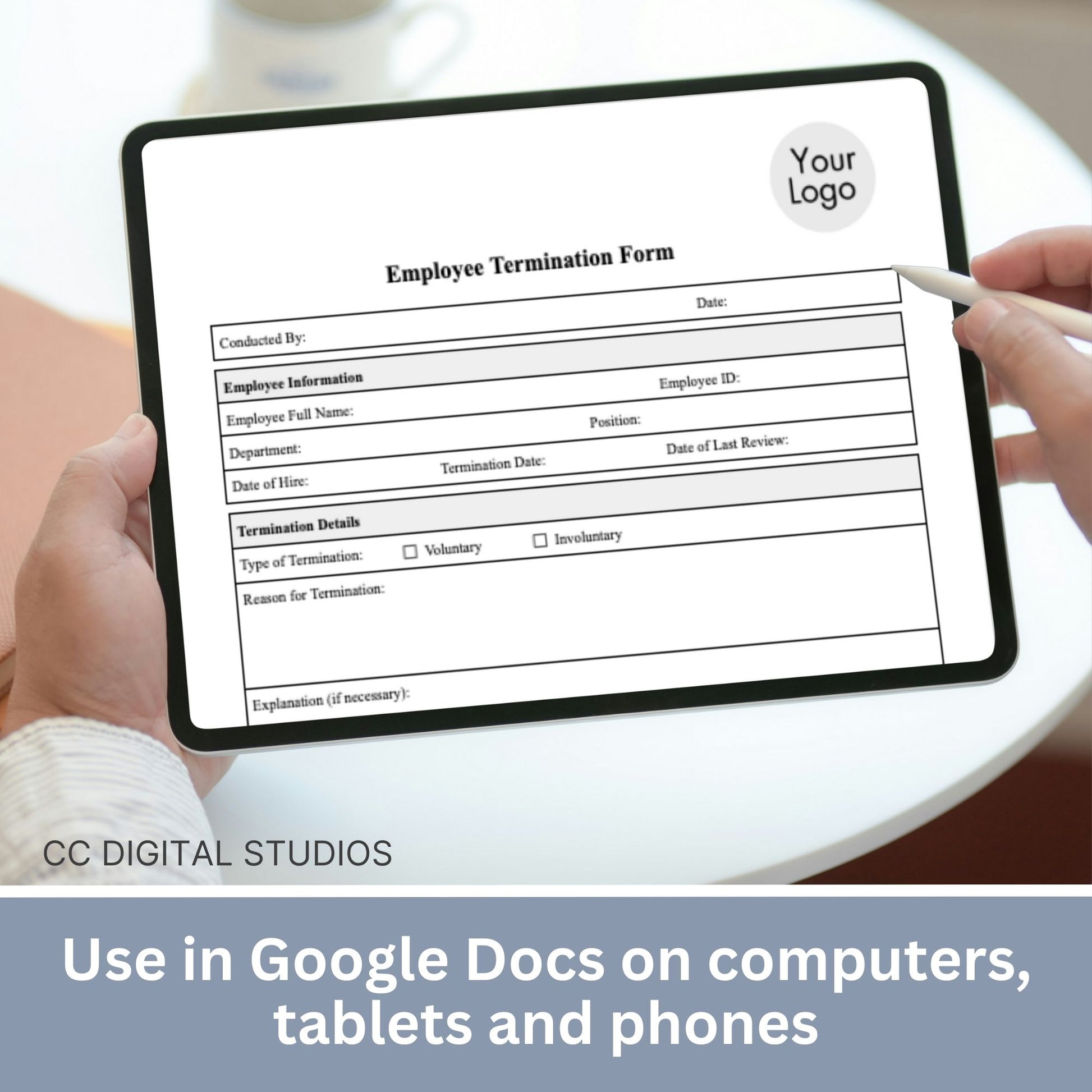 Employee termination form for HR professionals and small business. Editable google doc form. Customize to fit your business needs including adding company logo and information. This form allows for documenting employee termination information. Includes area to capture employee signature.