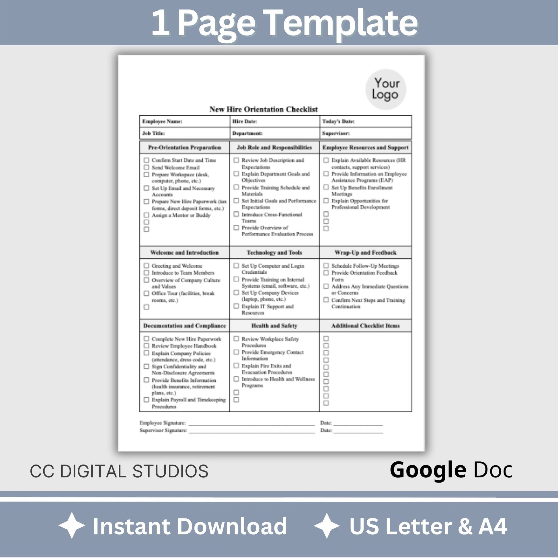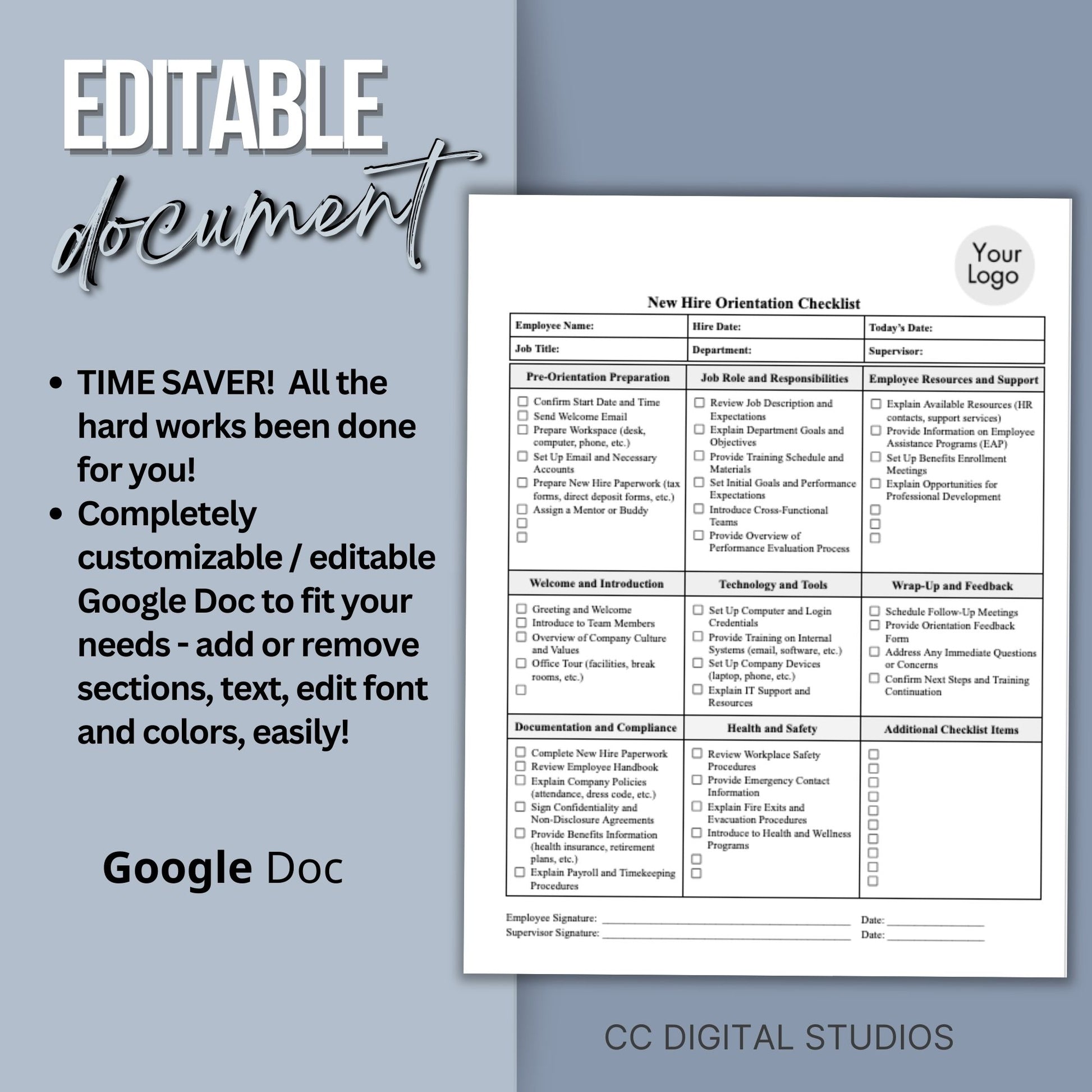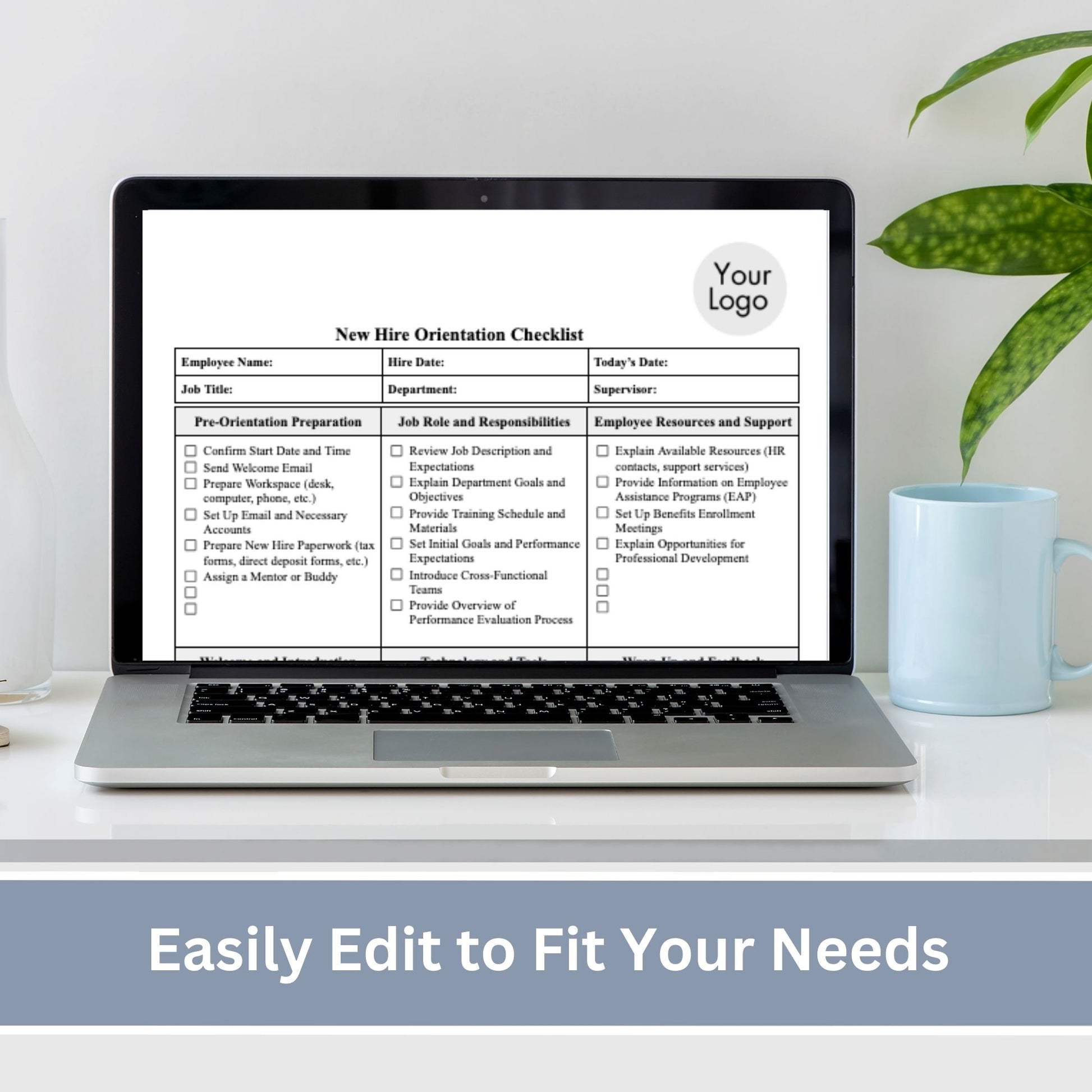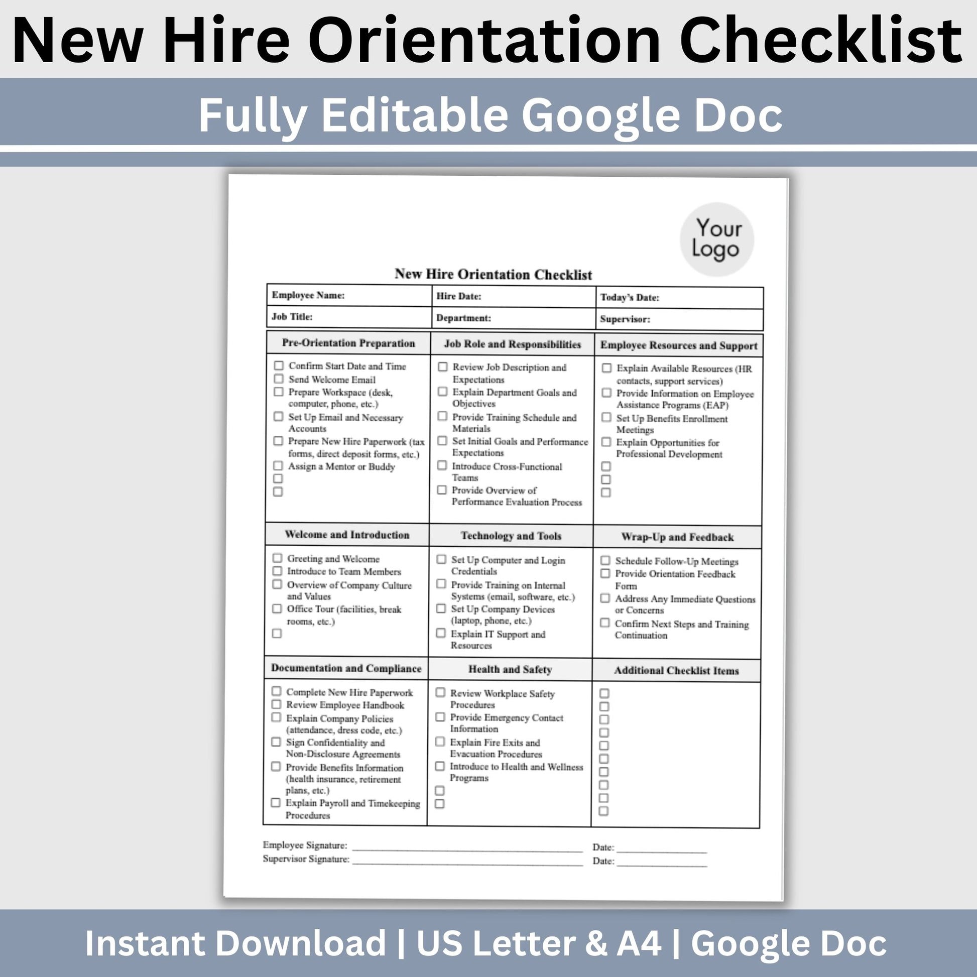 New Hire Orientation Checklist, employee onboarding checklist designed to streamline your HR processes. This HR template ensures a smooth and efficient new hire onboarding experience, covering everything from pre-orientation prep to job role expectations. Ideal for HR professionals, this Human Resources form includes all essential steps and documentation to set up new employees for success. Simplify your new hire paperwork with our easy-to-use fully editable Google Doc onboarding template, perfect for any organization looking to enhance their HR forms toolkit.