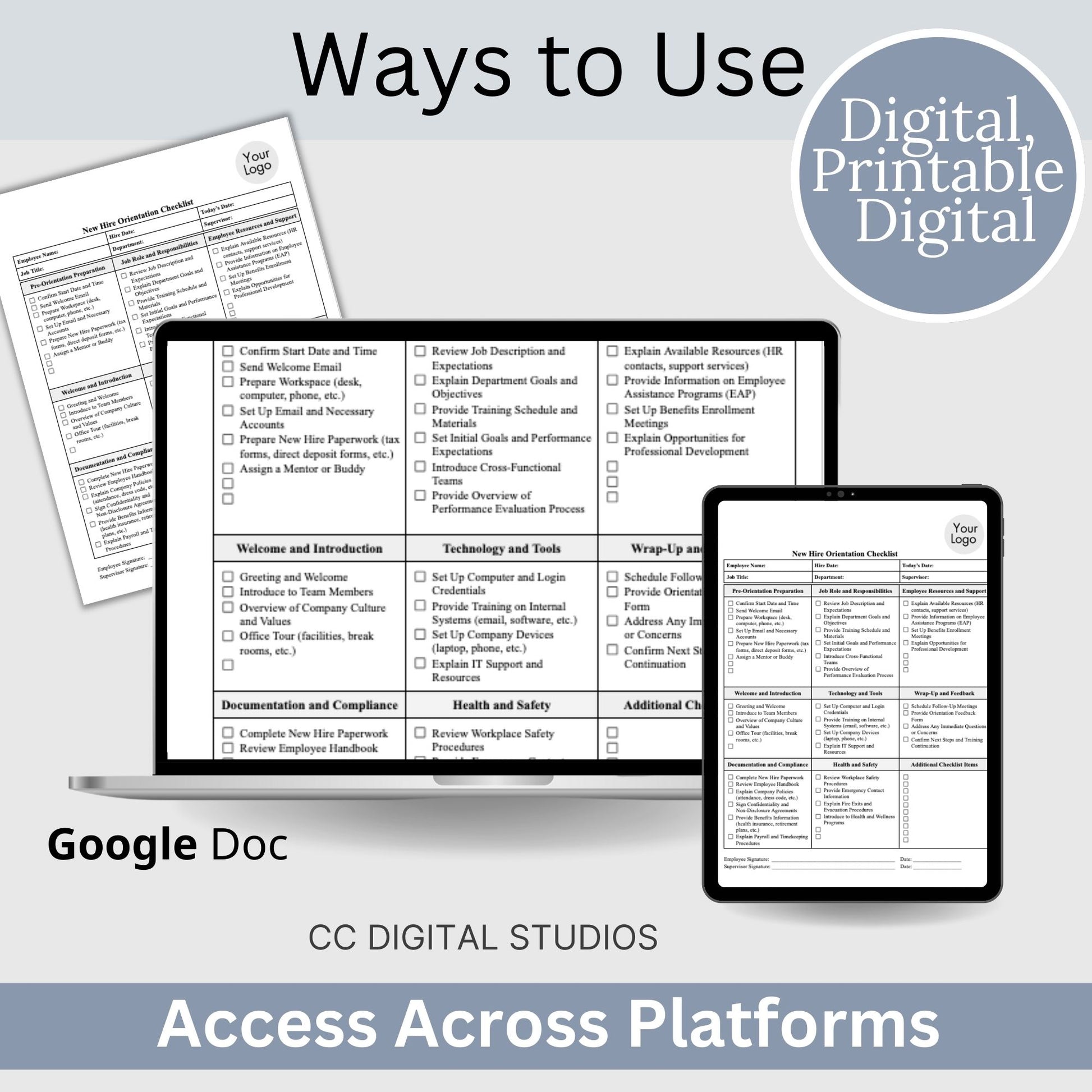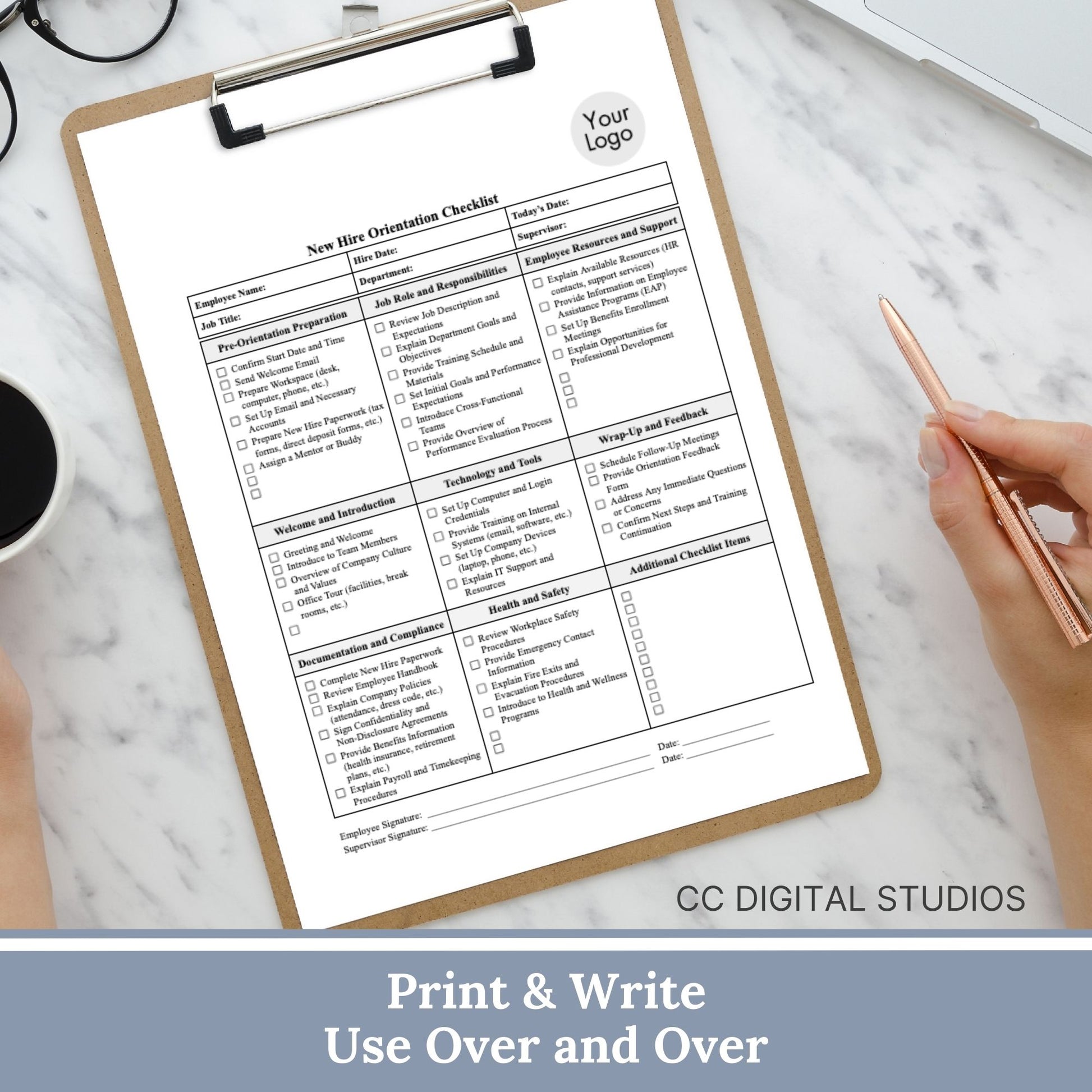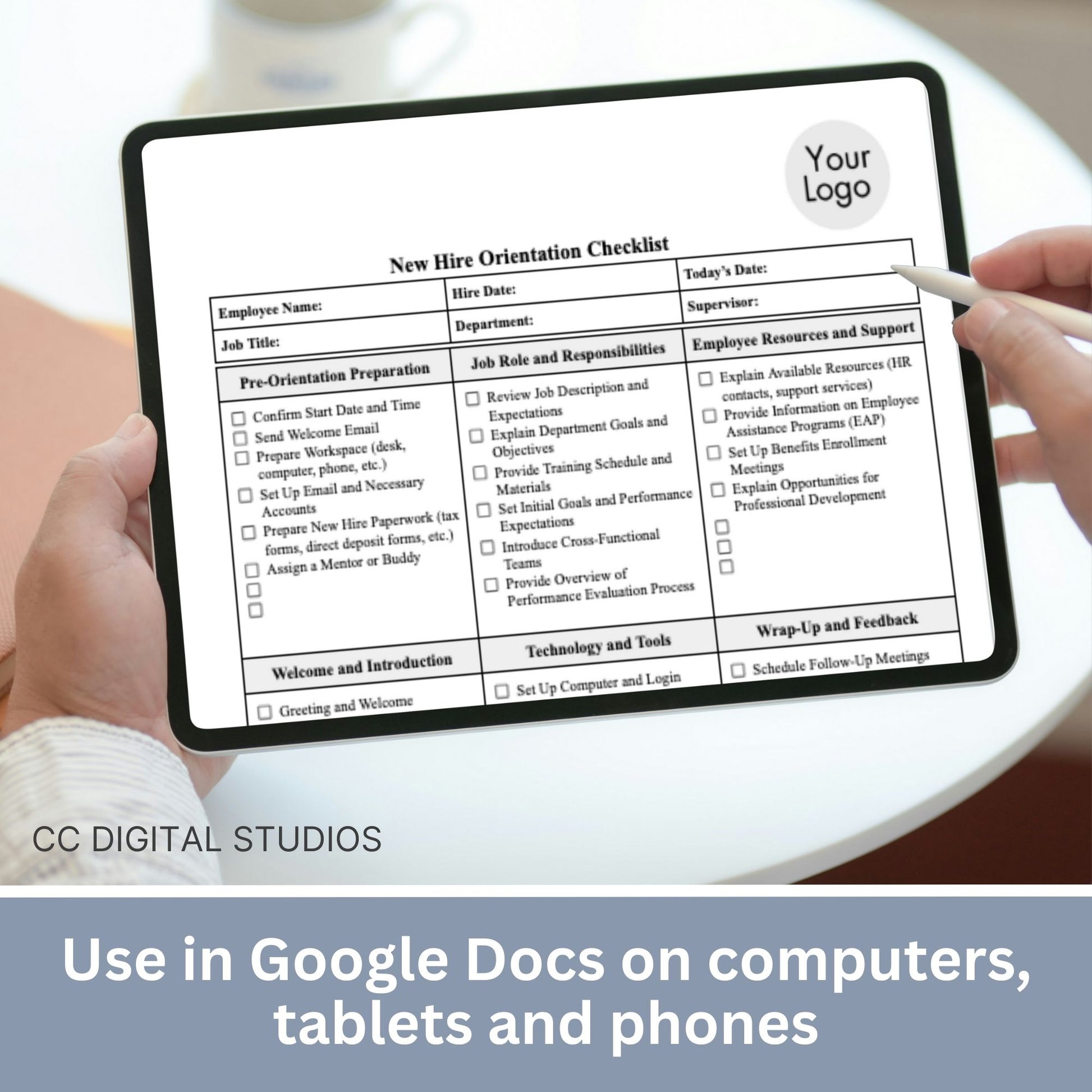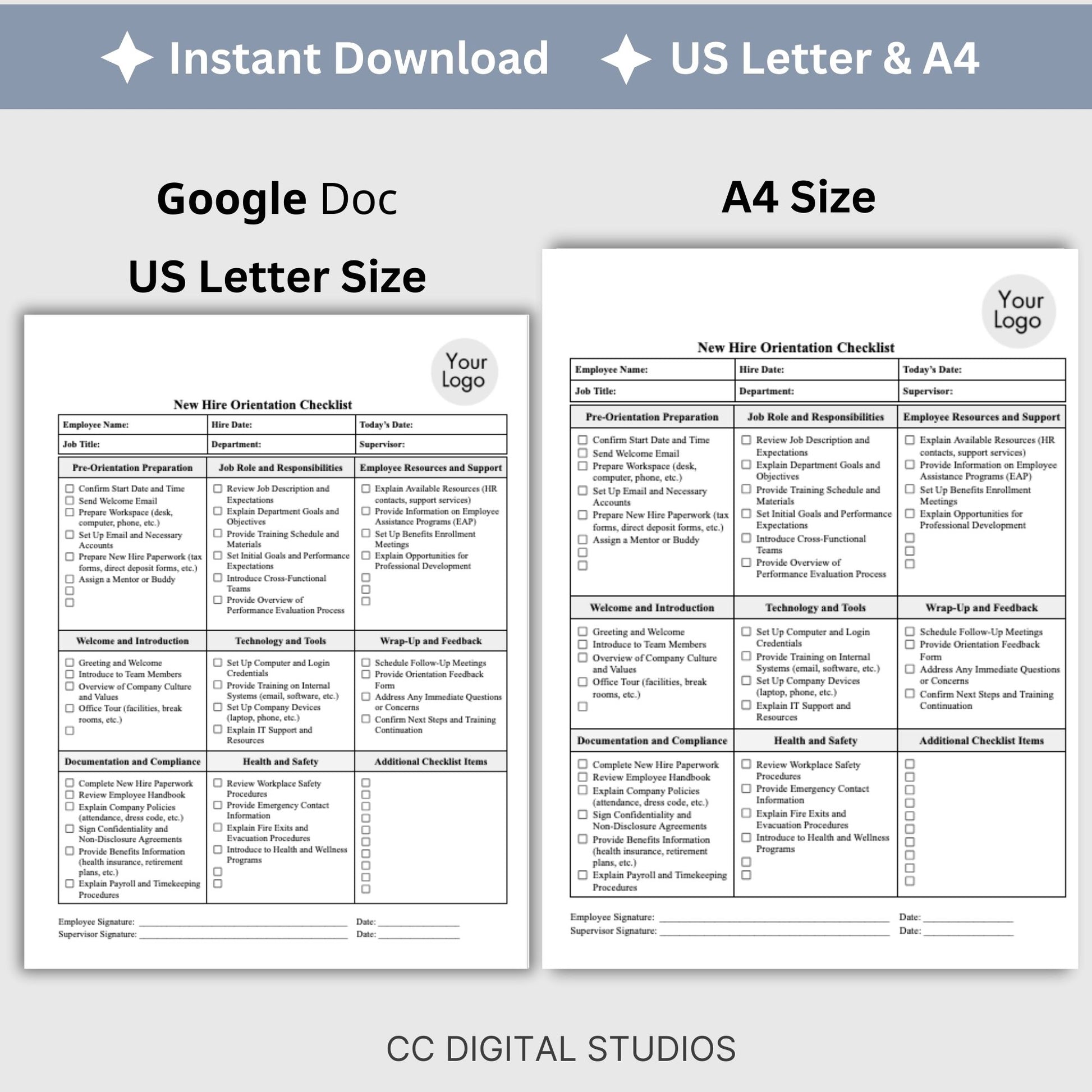 New Hire Orientation Checklist, employee onboarding checklist designed to streamline your HR processes. This HR template ensures a smooth and efficient new hire onboarding experience, covering everything from pre-orientation prep to job role expectations. Ideal for HR professionals, this Human Resources form includes all essential steps and documentation to set up new employees for success. Simplify your new hire paperwork with our easy-to-use fully editable Google Doc onboarding template, perfect for any organization looking to enhance their HR forms toolkit.