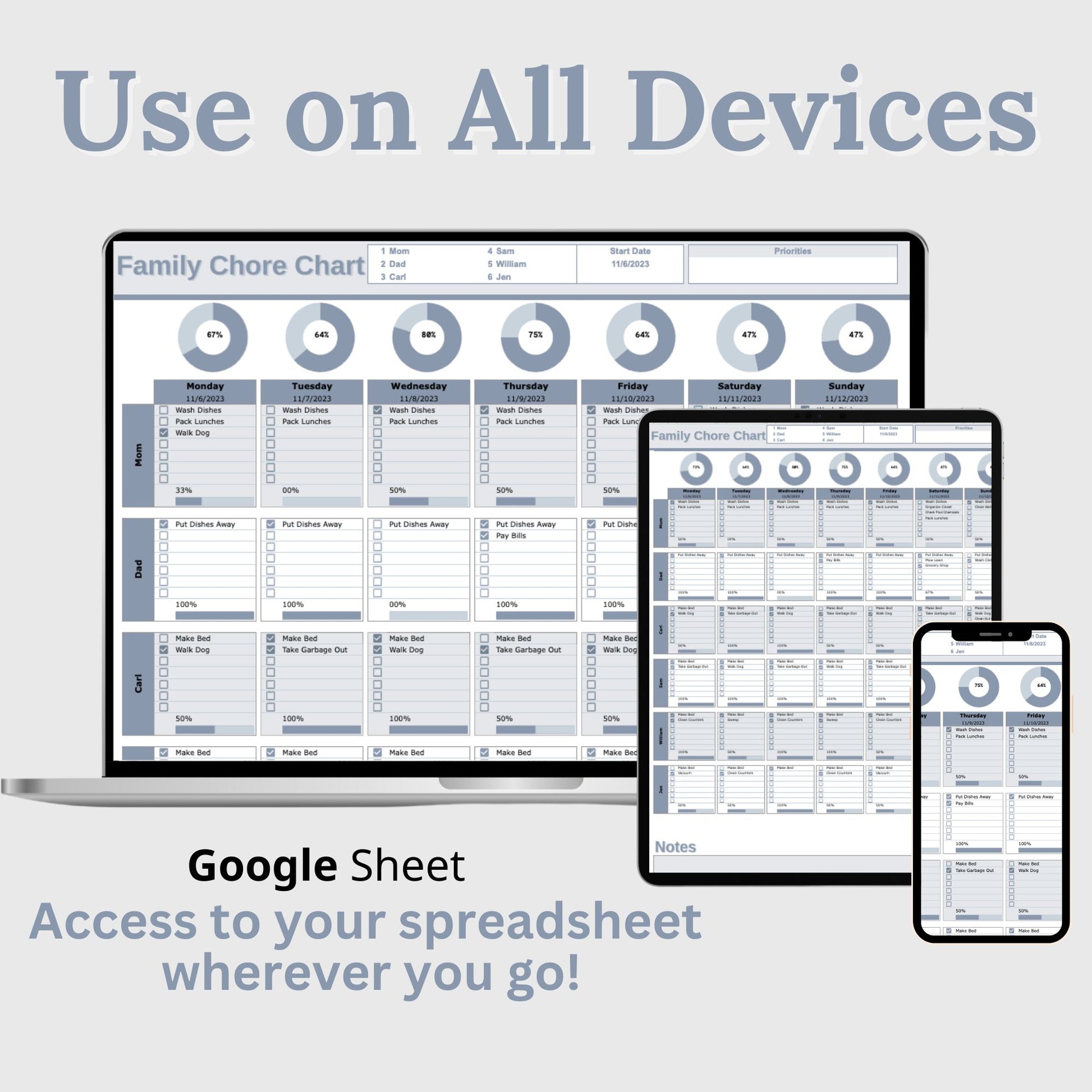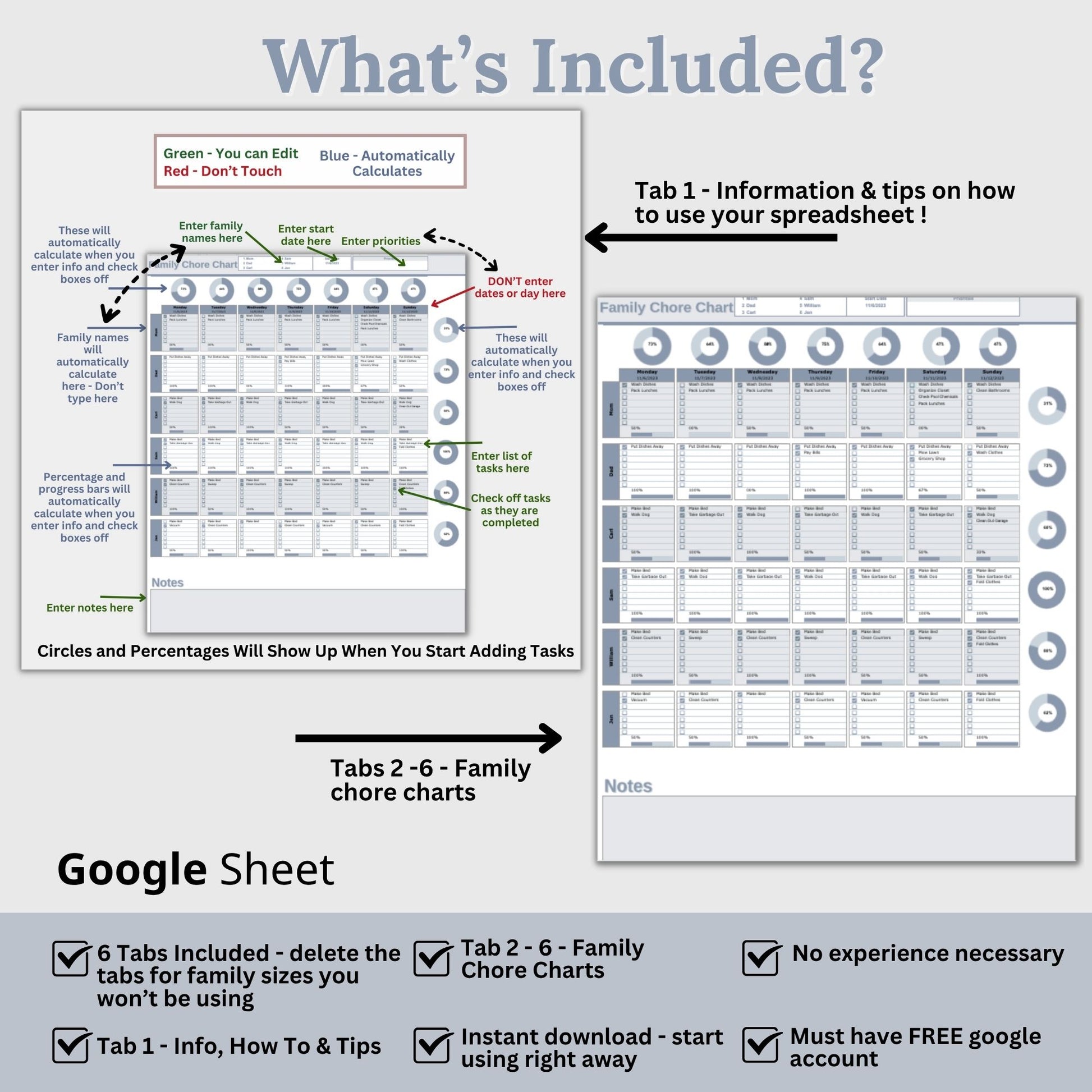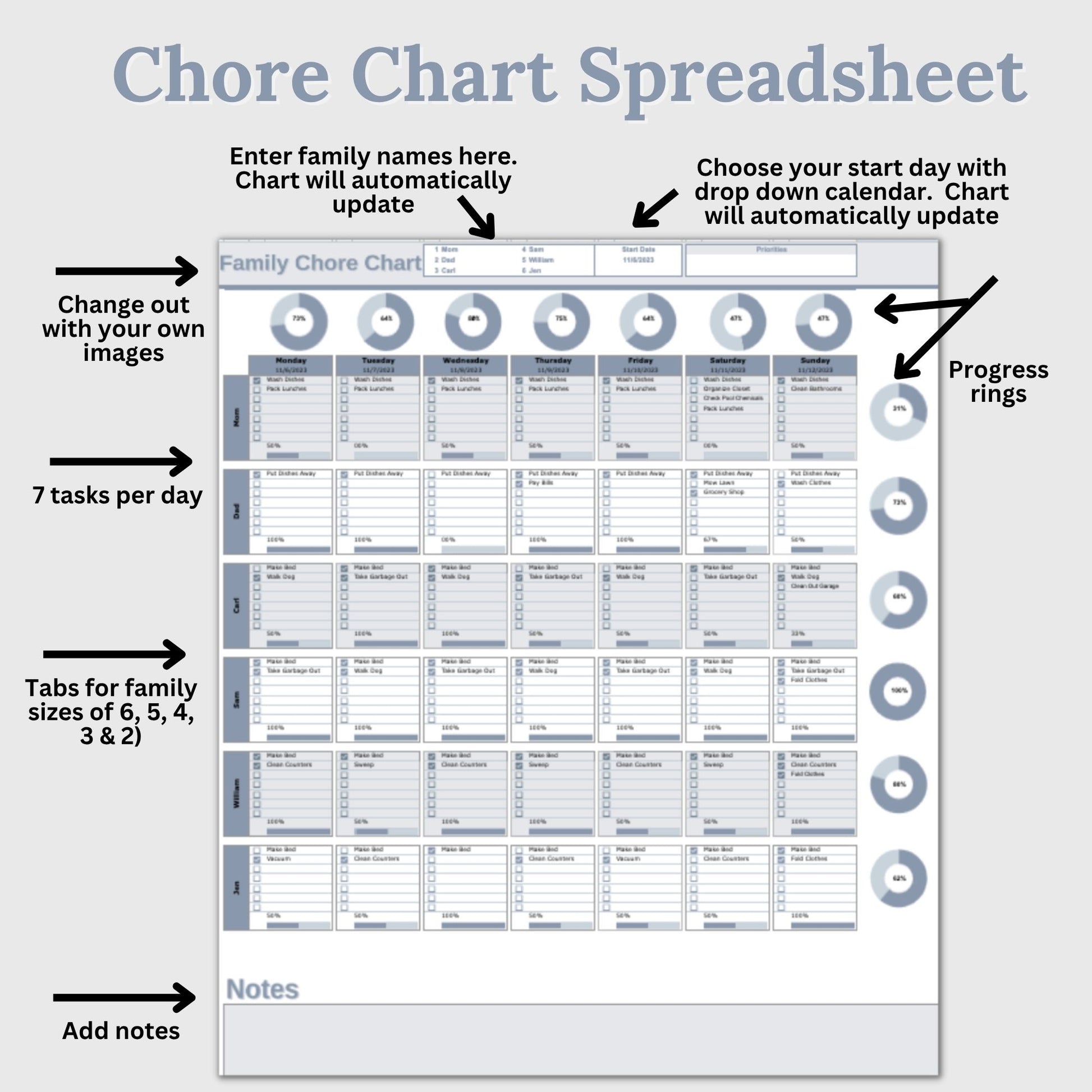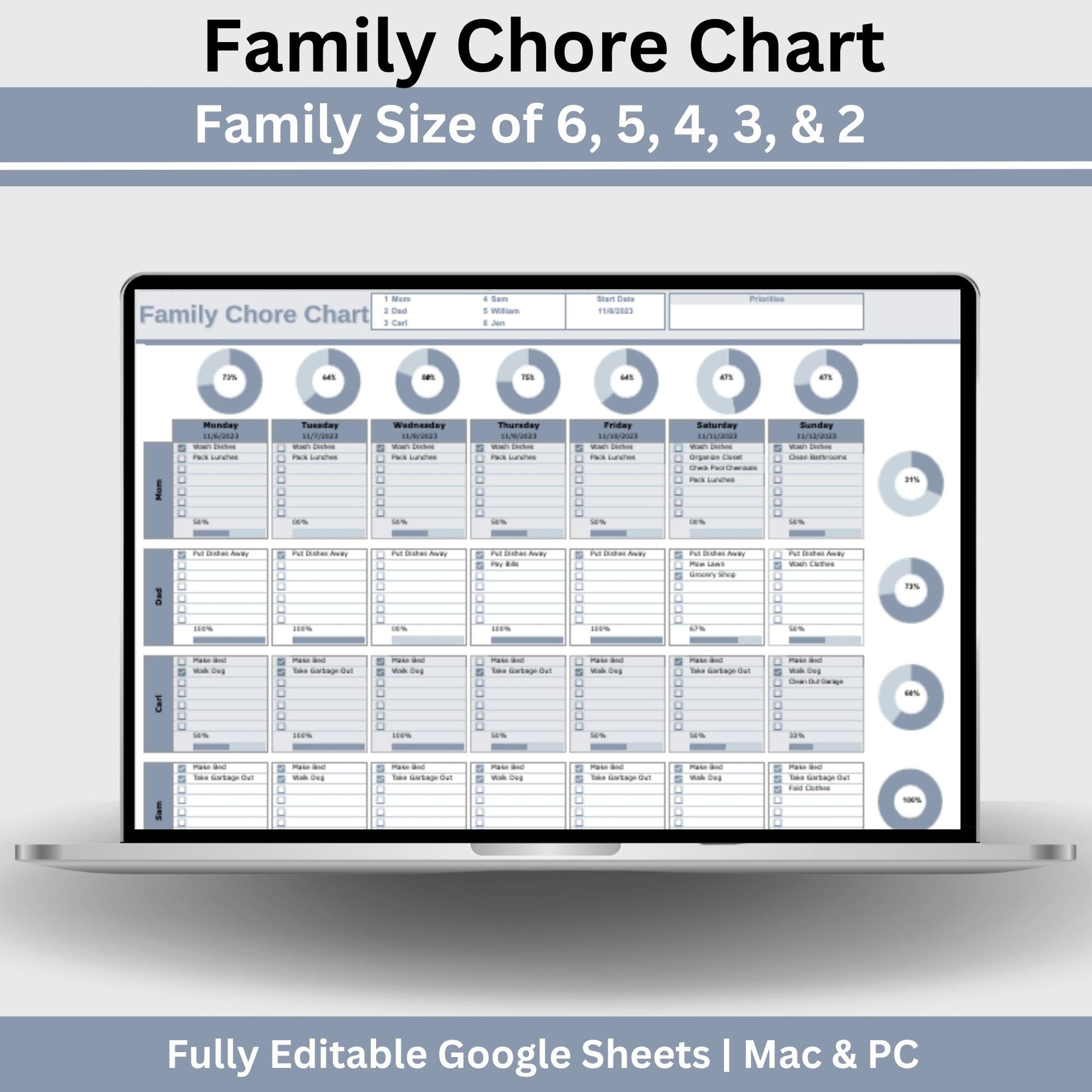 Get ready for some family fun and healthy competition with our new Google Sheets Family Chore Chart! Tabs for family sizes 6, 5, 4, 3 & 2. Easily delete the tabs that aren't your family size. We've added colorful and interactive ring charts to track your daily and weekly progress. Each family member has their own individual ring, and as you complete your tasks each day, you'll watch your ring close in real-time, creating a sense of accomplishment and motivation. The donut charts also provide an overview of the family's overall progress, encouraging everyone to work together to reach your weekly goals. It's a fantastic way to turn daily chores into a game, making the chores more engaging and rewarding. So, let the friendly competition begin and watch those rings close as you conquer your tasks and enjoy the satisfaction of a job well done!
