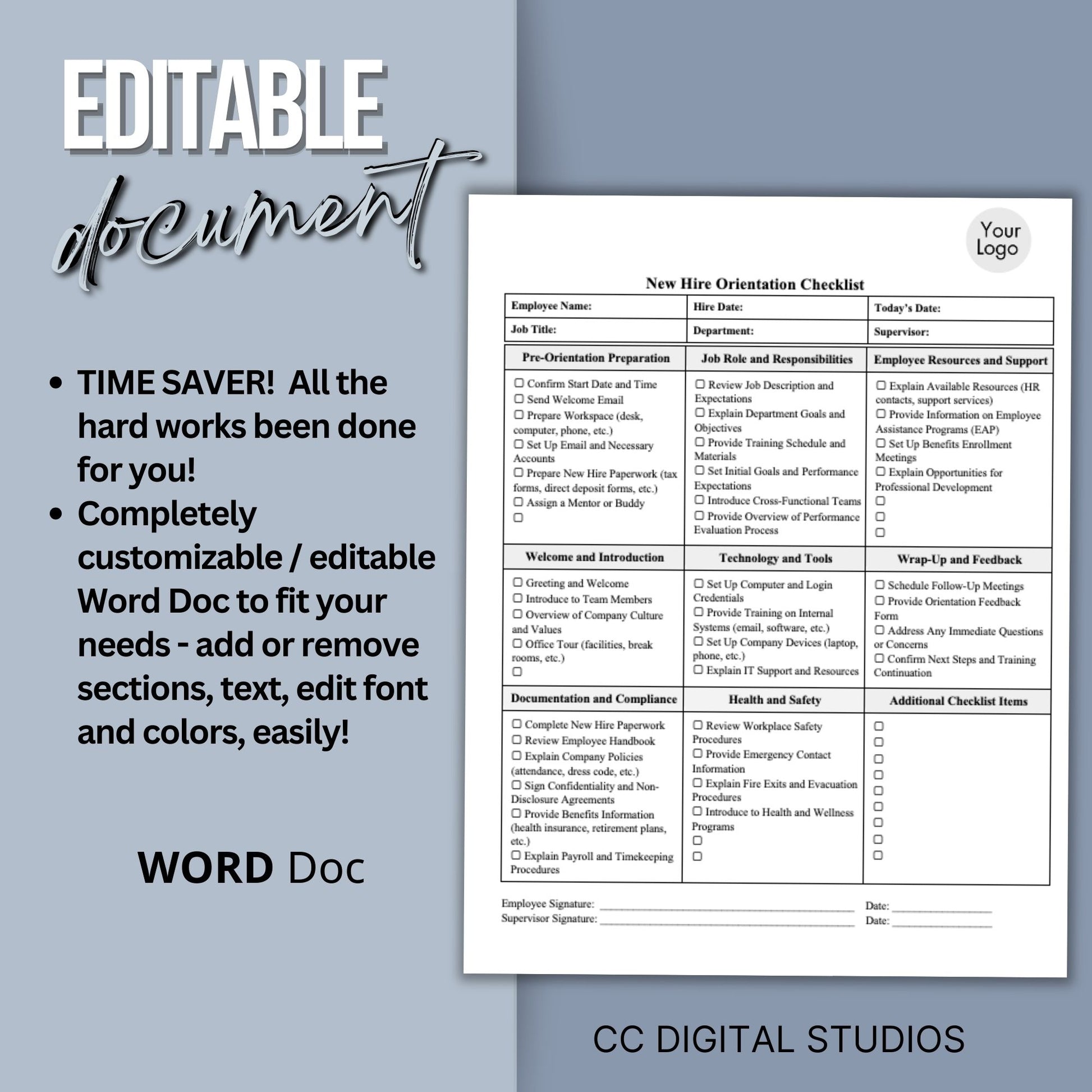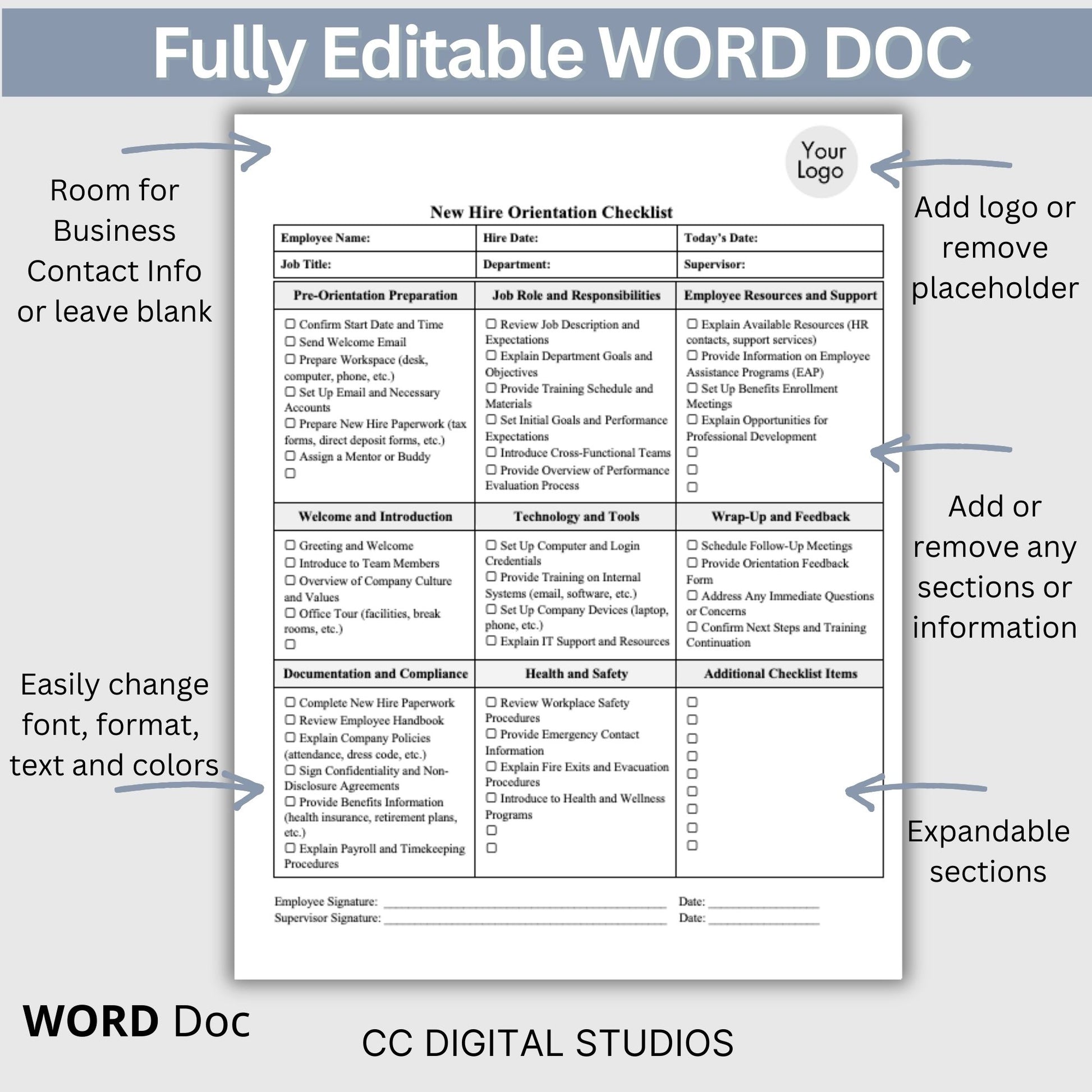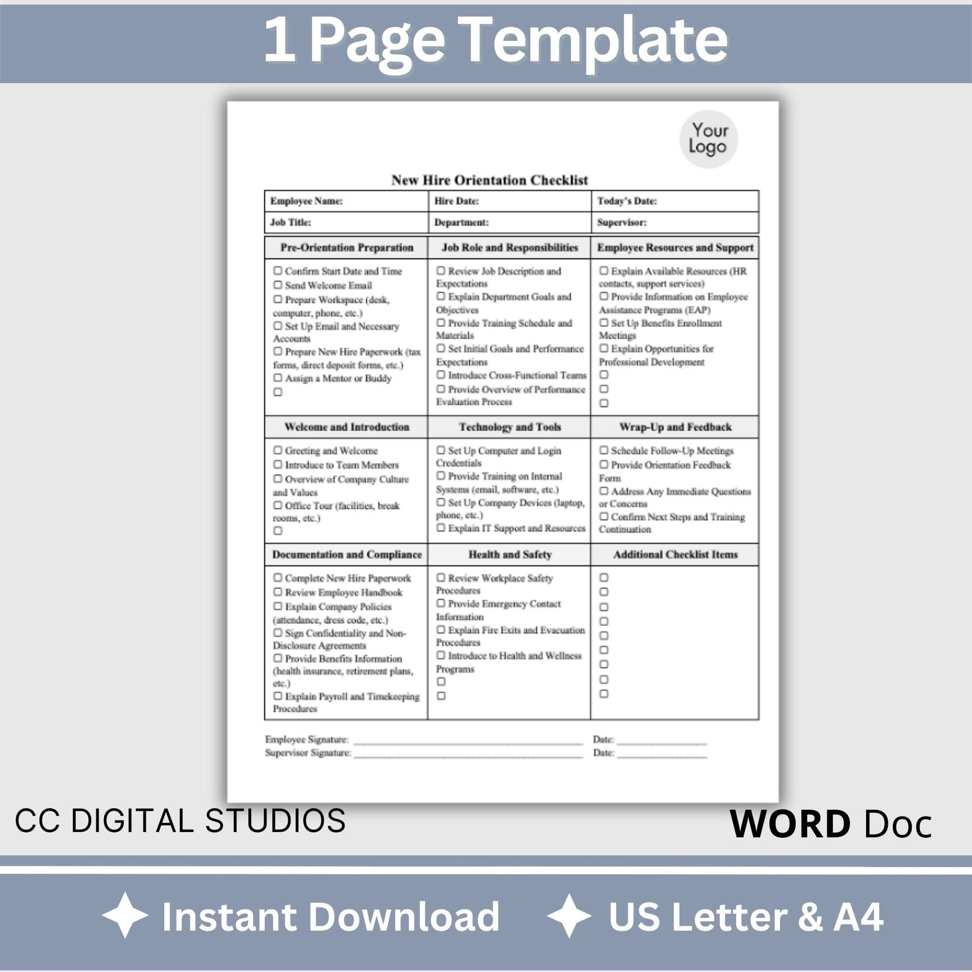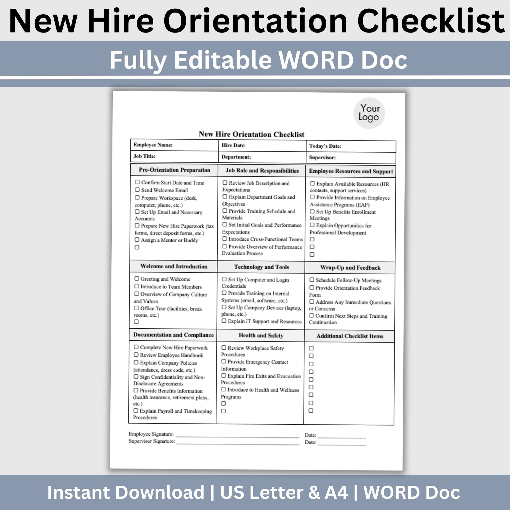 New Hire Orientation Checklist, employee onboarding checklist designed to streamline your HR processes. This HR template ensures a smooth and efficient new hire onboarding experience, covering everything from pre-orientation prep to job role expectations. Ideal for HR professionals, this Human Resources form includes all essential steps and documentation to set up new employees for success. Simplify your new hire paperwork with our easy-to-use fully editable WORD doc onboarding template, perfect for any organization looking to enhance their HR forms toolkit.