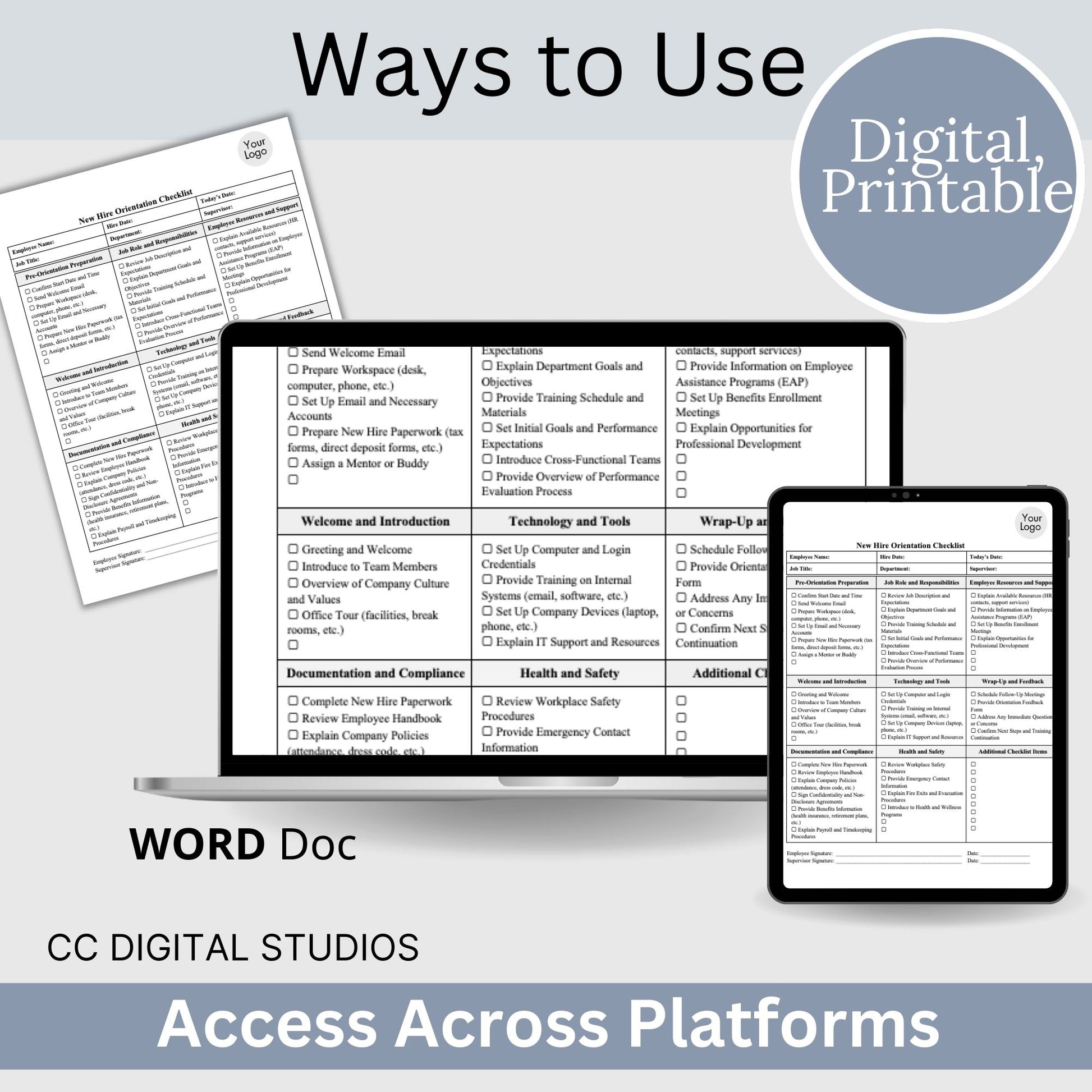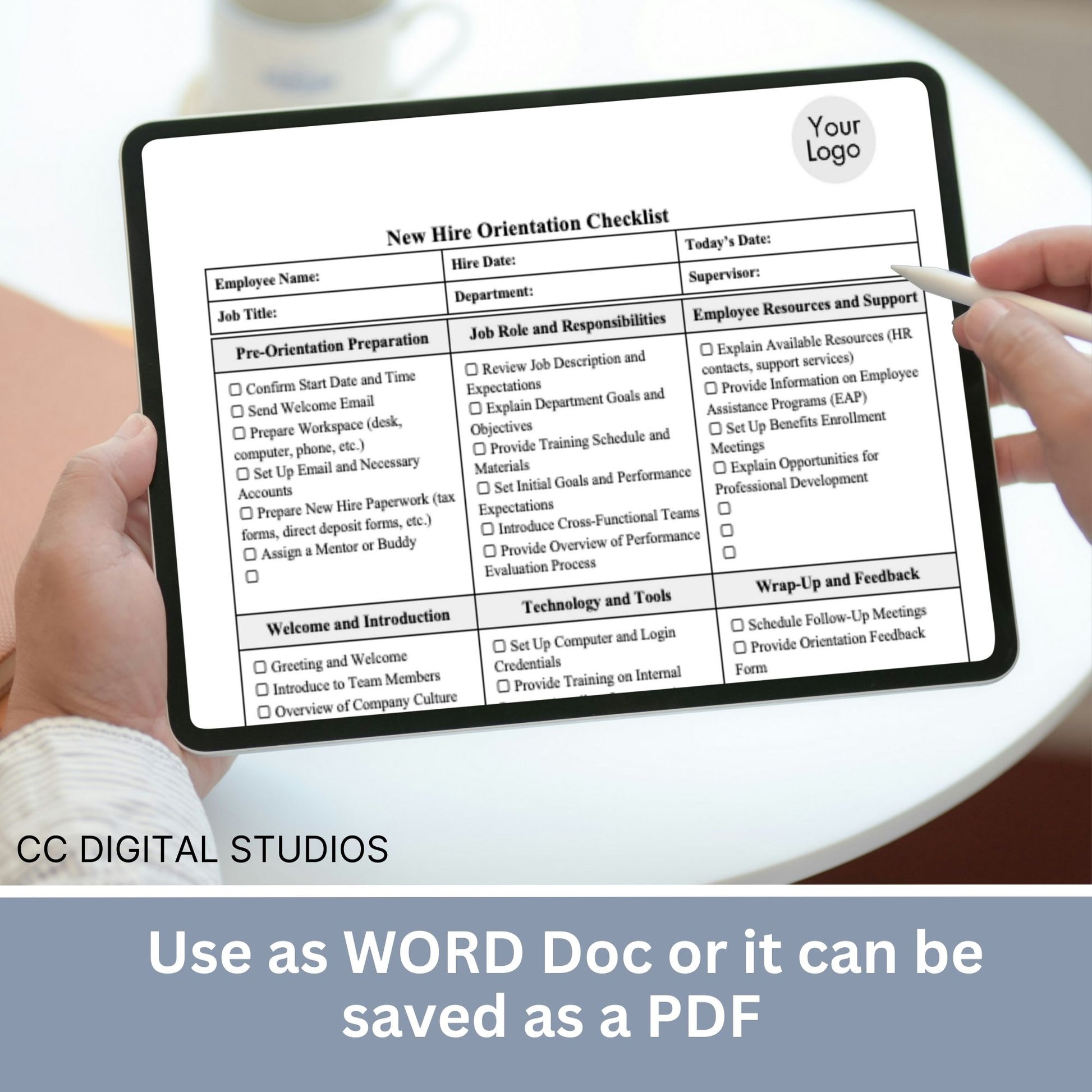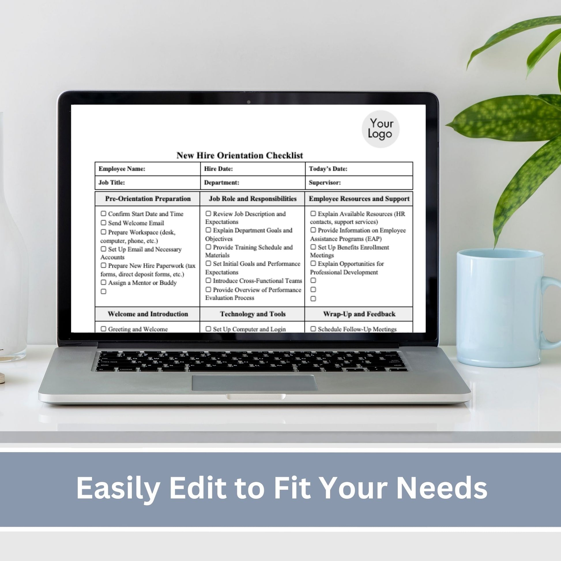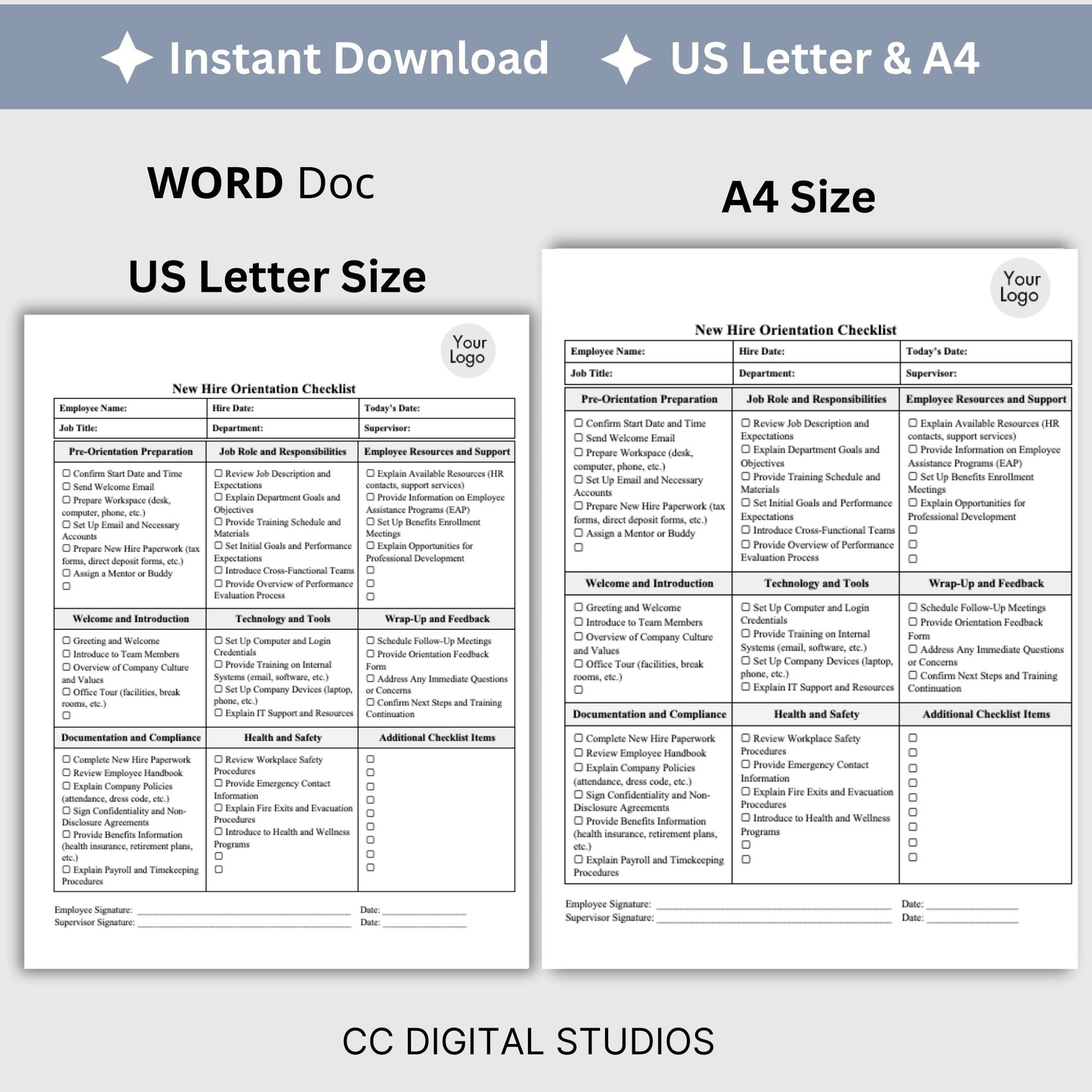 New Hire Orientation Checklist, employee onboarding checklist designed to streamline your HR processes. This HR template ensures a smooth and efficient new hire onboarding experience, covering everything from pre-orientation prep to job role expectations. Ideal for HR professionals, this Human Resources form includes all essential steps and documentation to set up new employees for success. Simplify your new hire paperwork with our easy-to-use fully editable WORD doc onboarding template, perfect for any organization looking to enhance their HR forms toolkit.