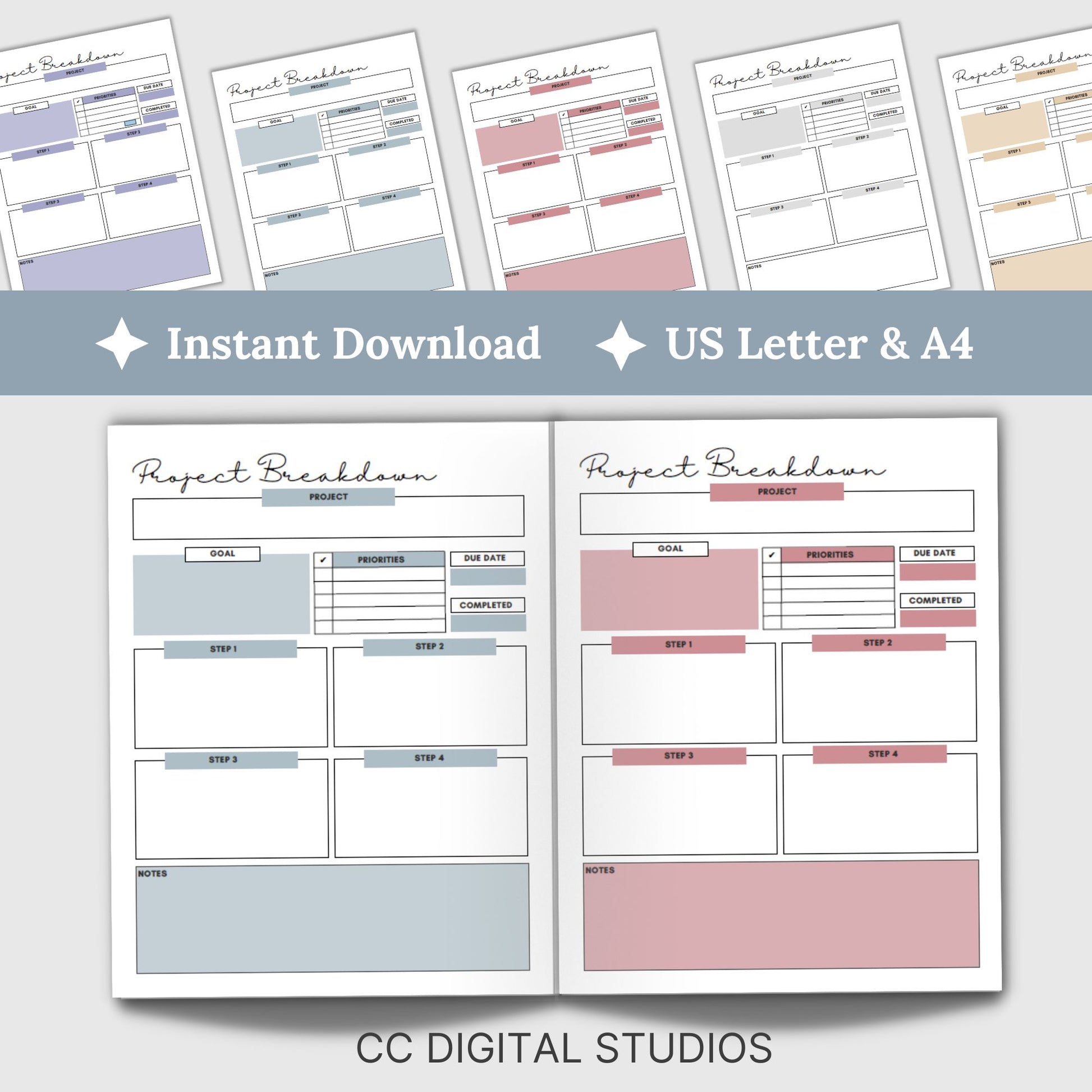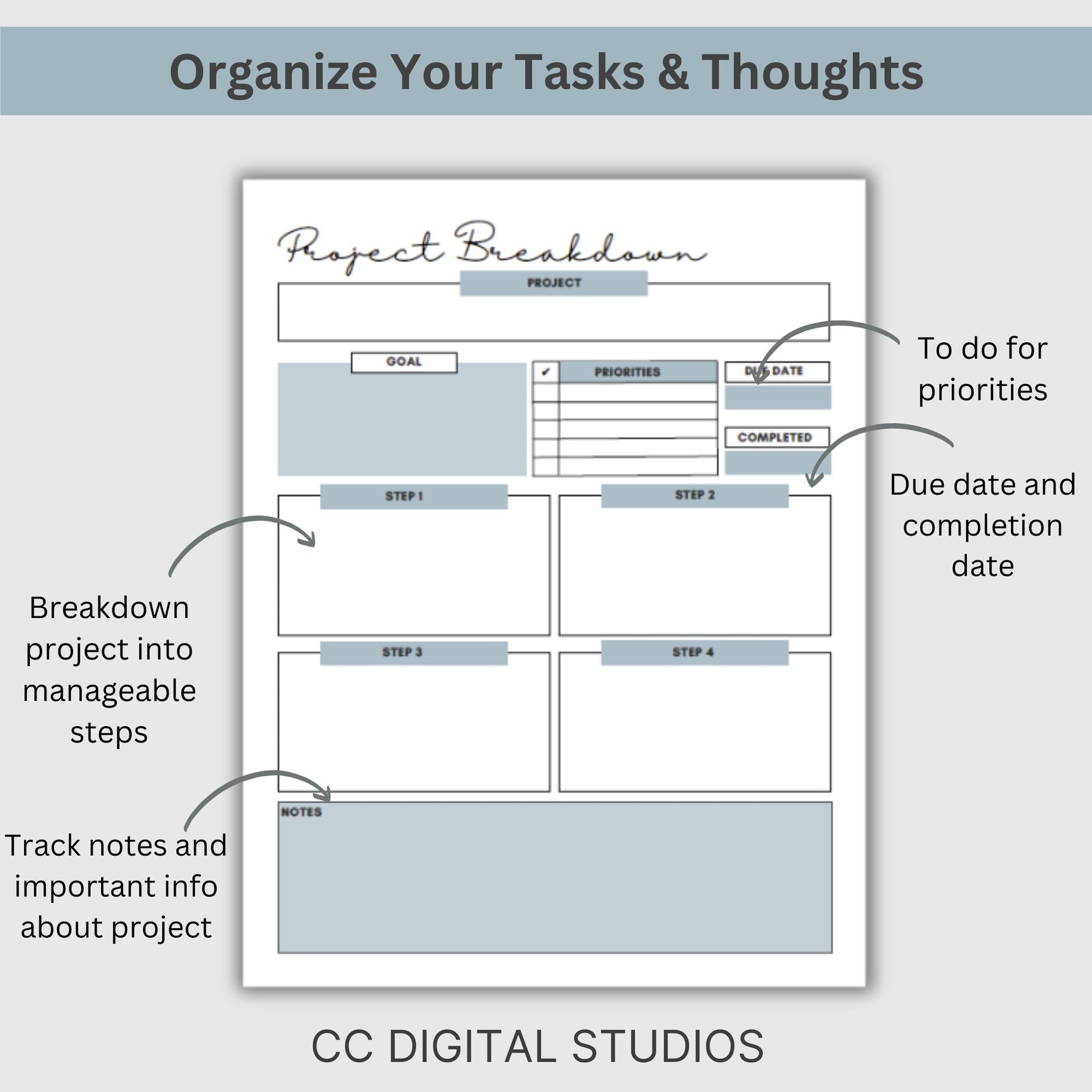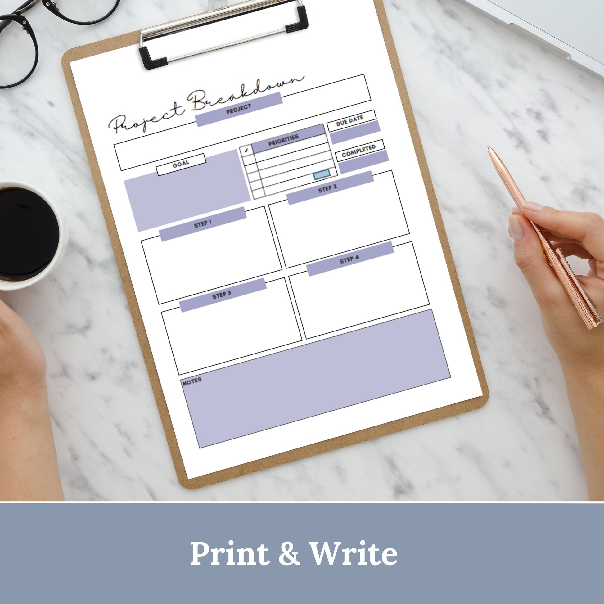 Efficient one-page project planning and step breakdown template, designed to help you stay organized and focused on your projects like never before. This minimalistic template is perfect for you to streamline your project management process and achieve your goals with ease.