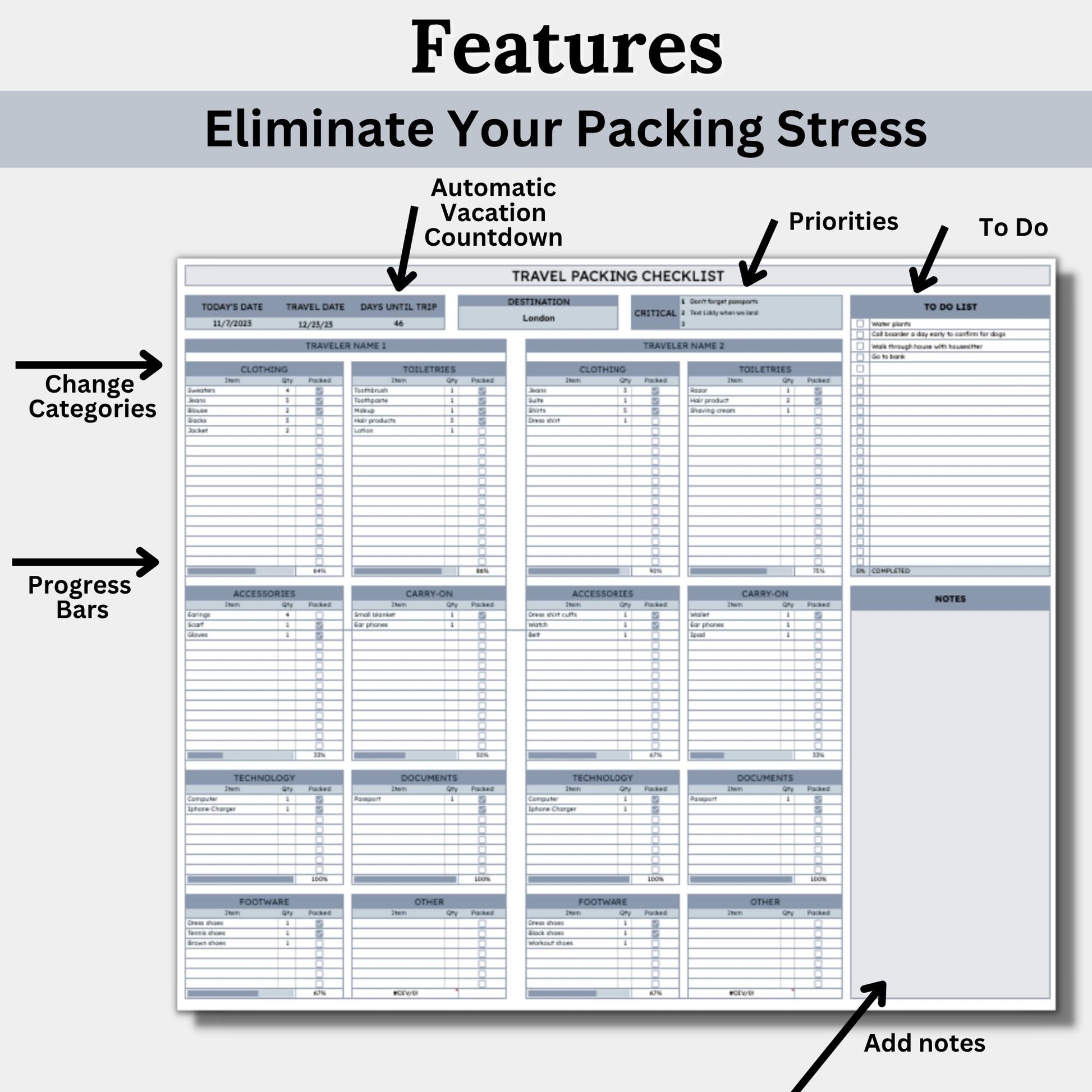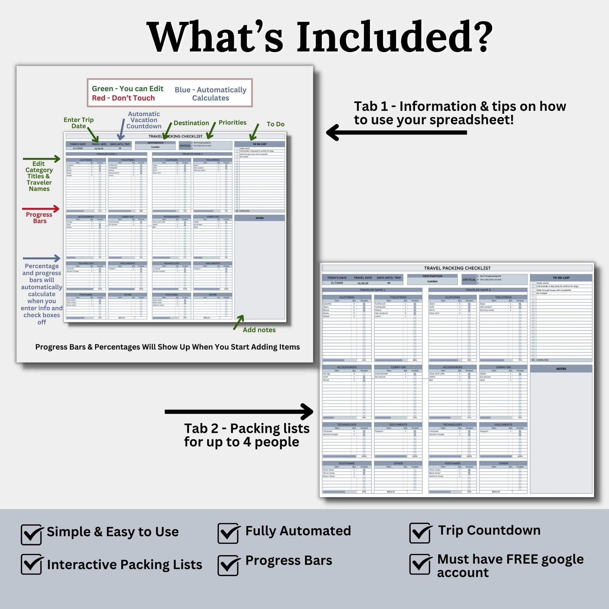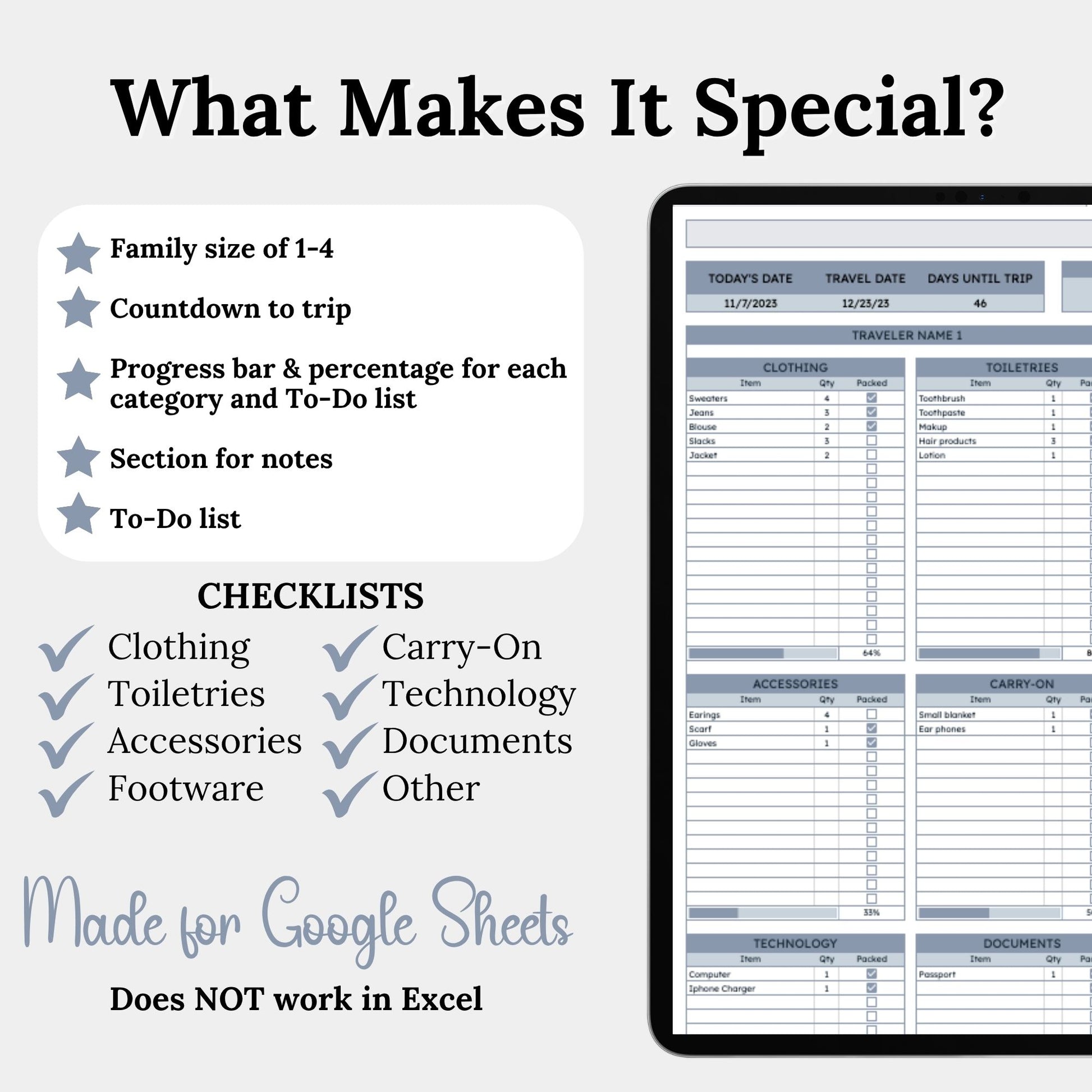 Stay organized on your next adventure with our comprehensive Google Sheets Travel Packing List! This editable checklist is your go-to packing template, ensuring you never forget travel essentials again. Perfect for families, this vacation checklist covers all bases, from clothing to toiletries and beyond. Simplify your trip planning with our customizable trip checklist today! Whether you're jet-setting alone or embarking on a family adventure, this travel checklist has got you covered for up to 4 travelers.